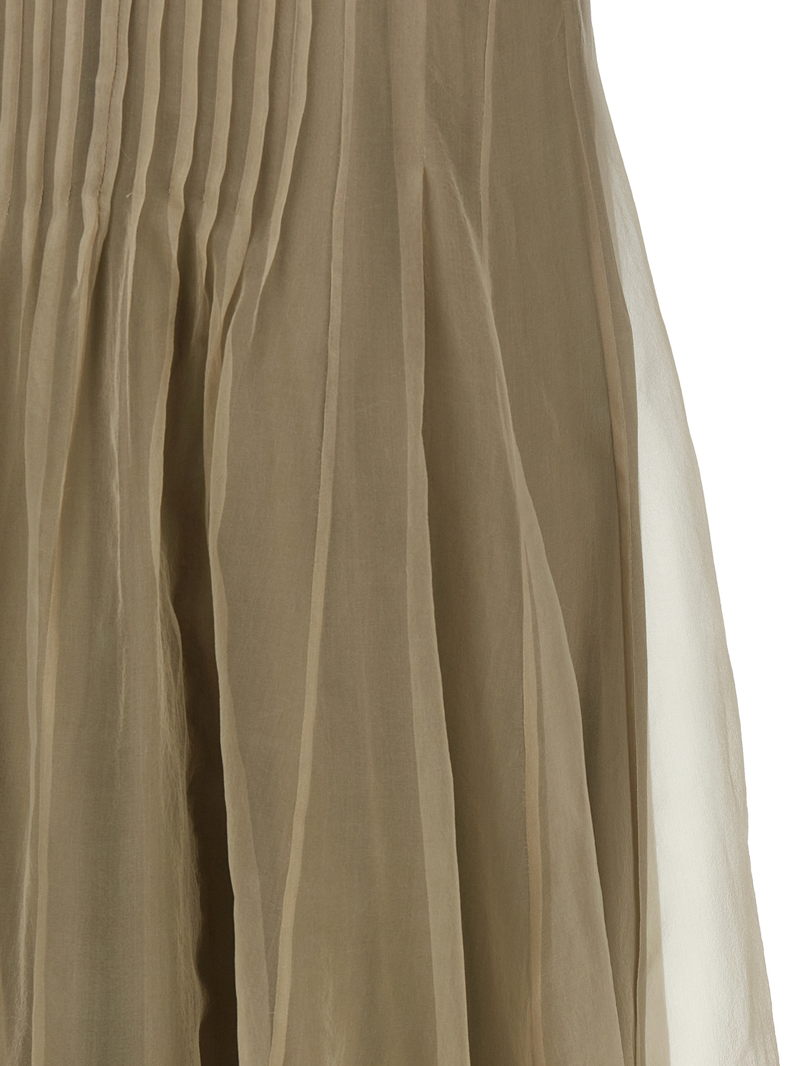 Long silk dress with pleats on the front and back, V-neck on the front and back with Monile detail on the back, sleeveless, and integrated petticoat.