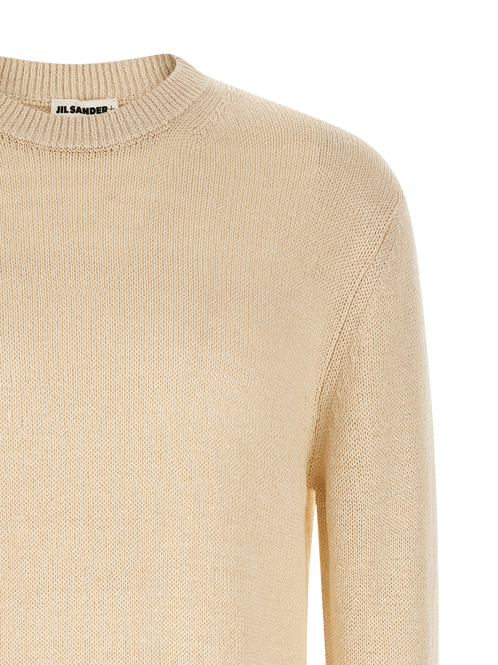 Hemp and silk blend sweater with coarse knit, crew neck, long sleeves with cuffs and dropped shoulder.