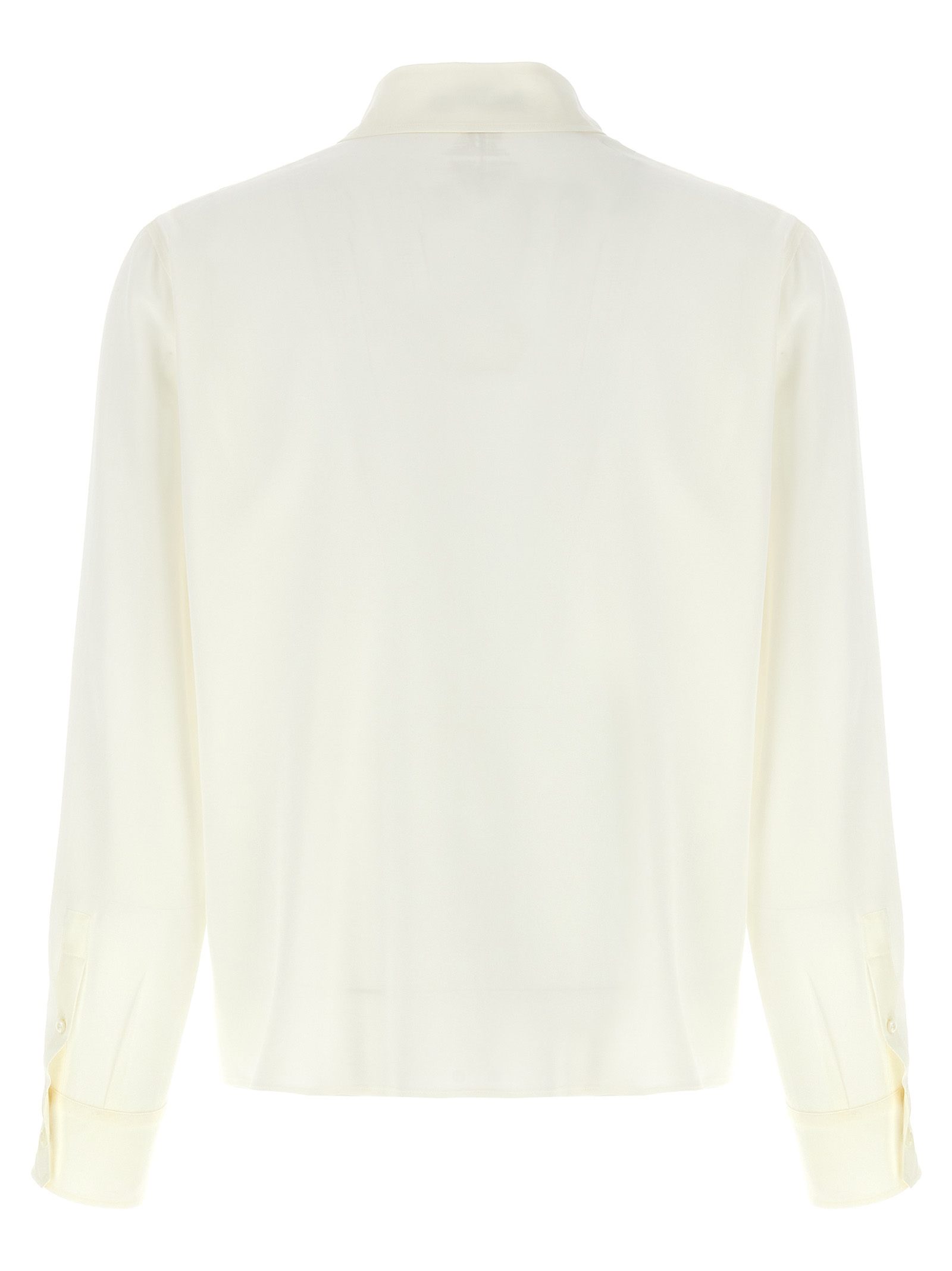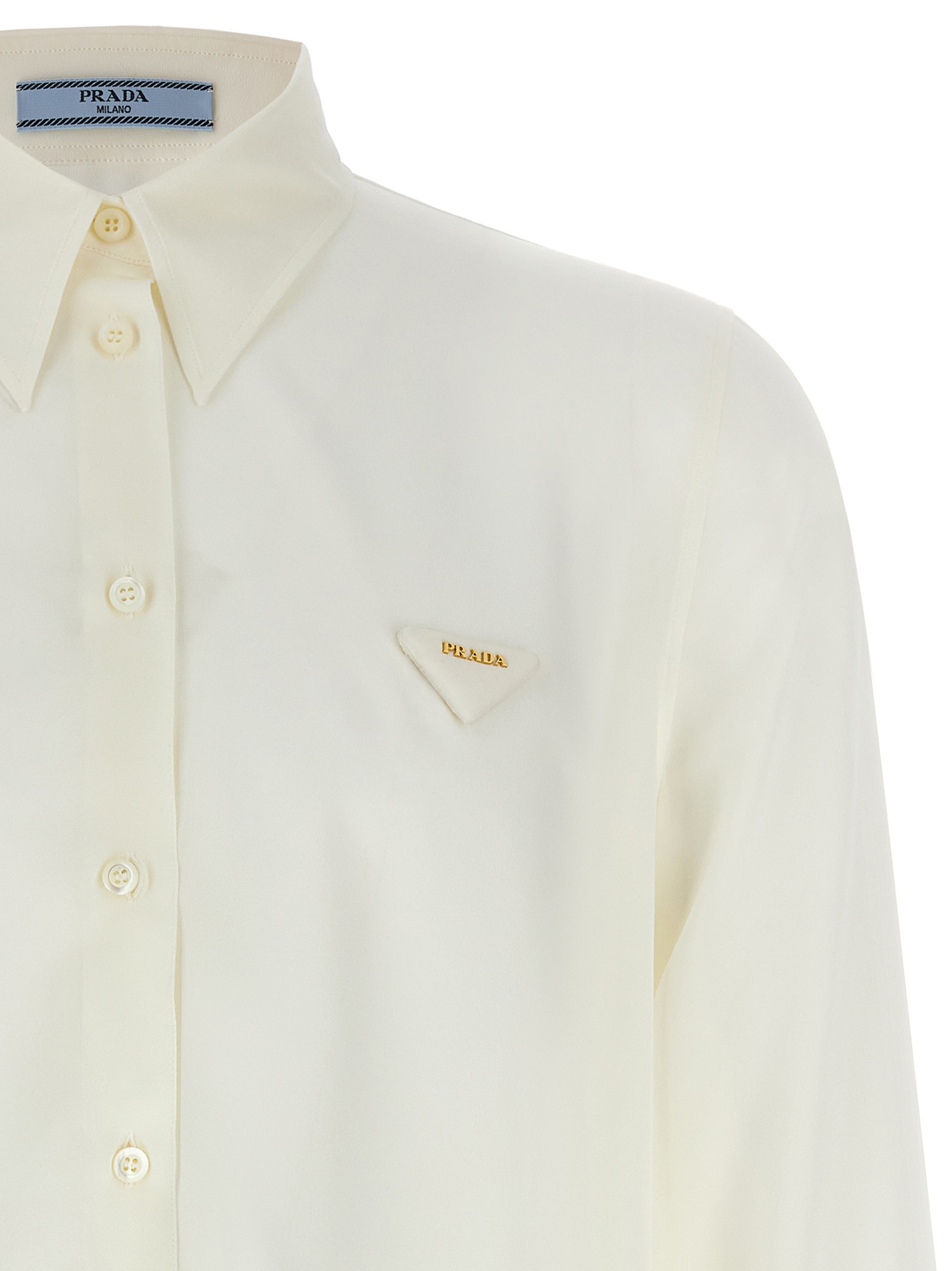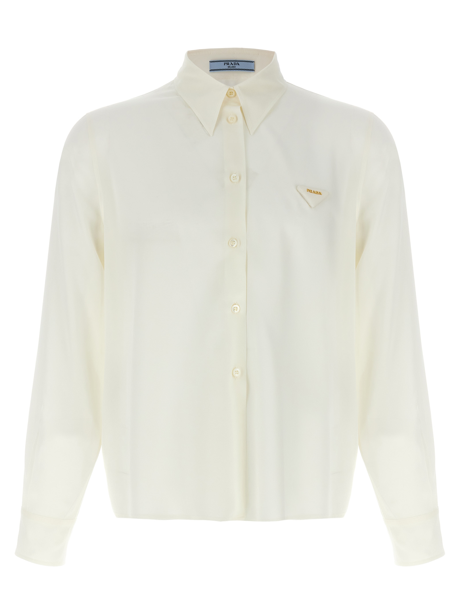 Silk shirt, fabric and metal front triangle logo, long sleeve with cuff, button closure.