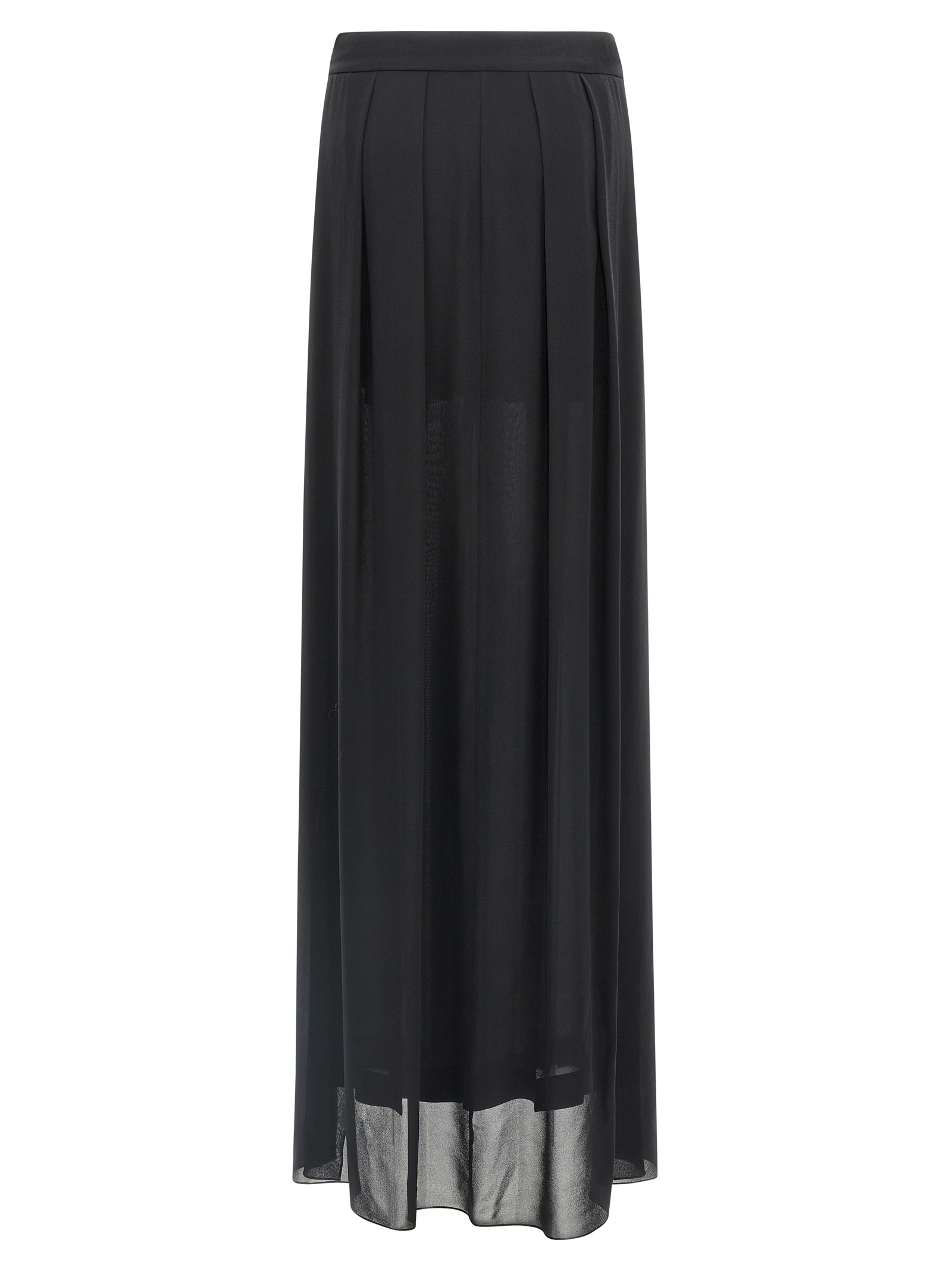 High-waisted silk georgette pants with palazzo style with front pleats, more asymmetrical back panel, and front zip and hook closure.
