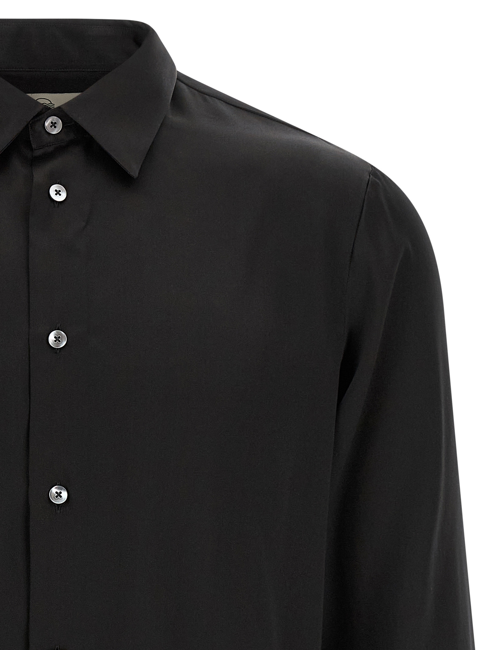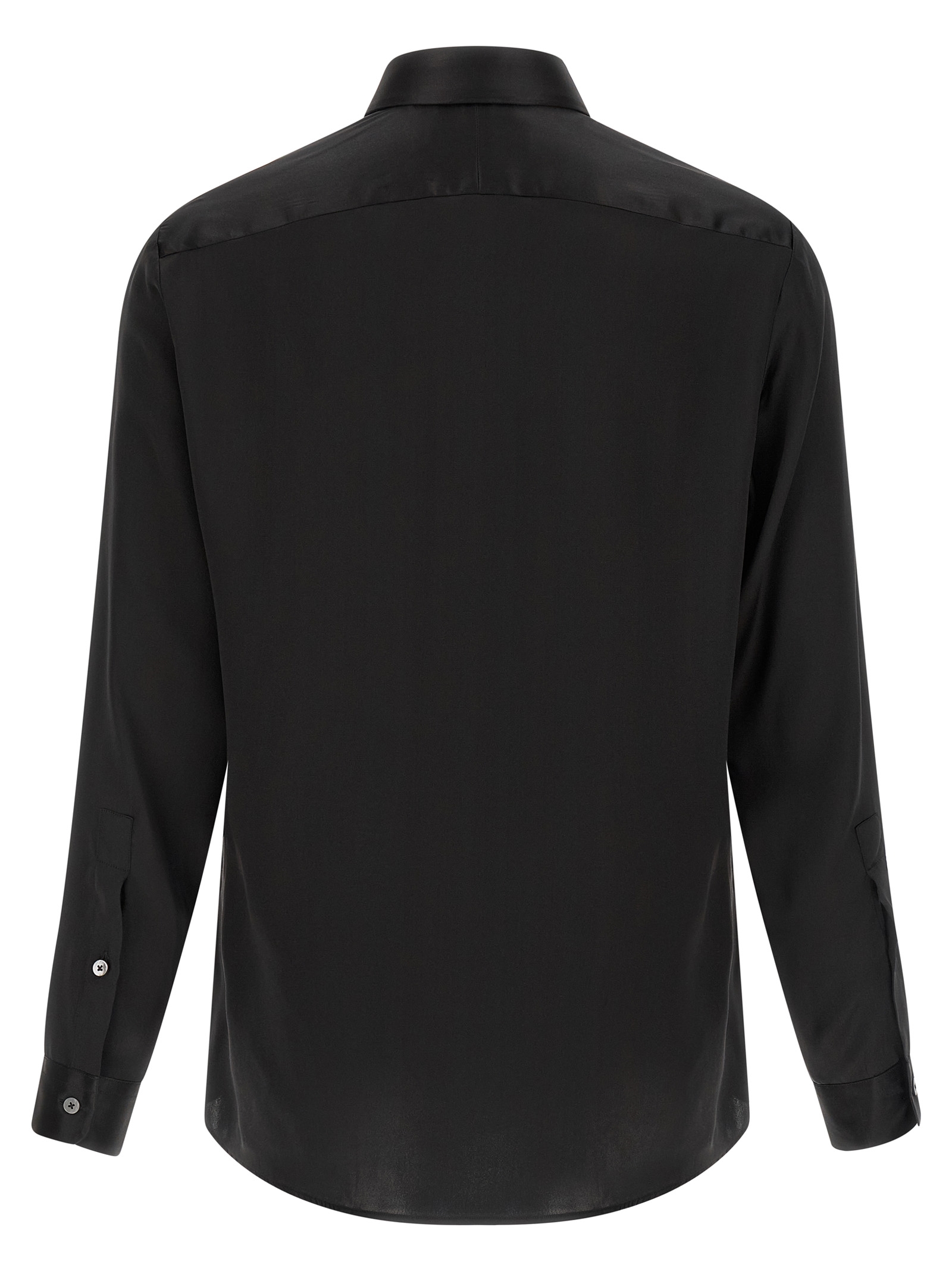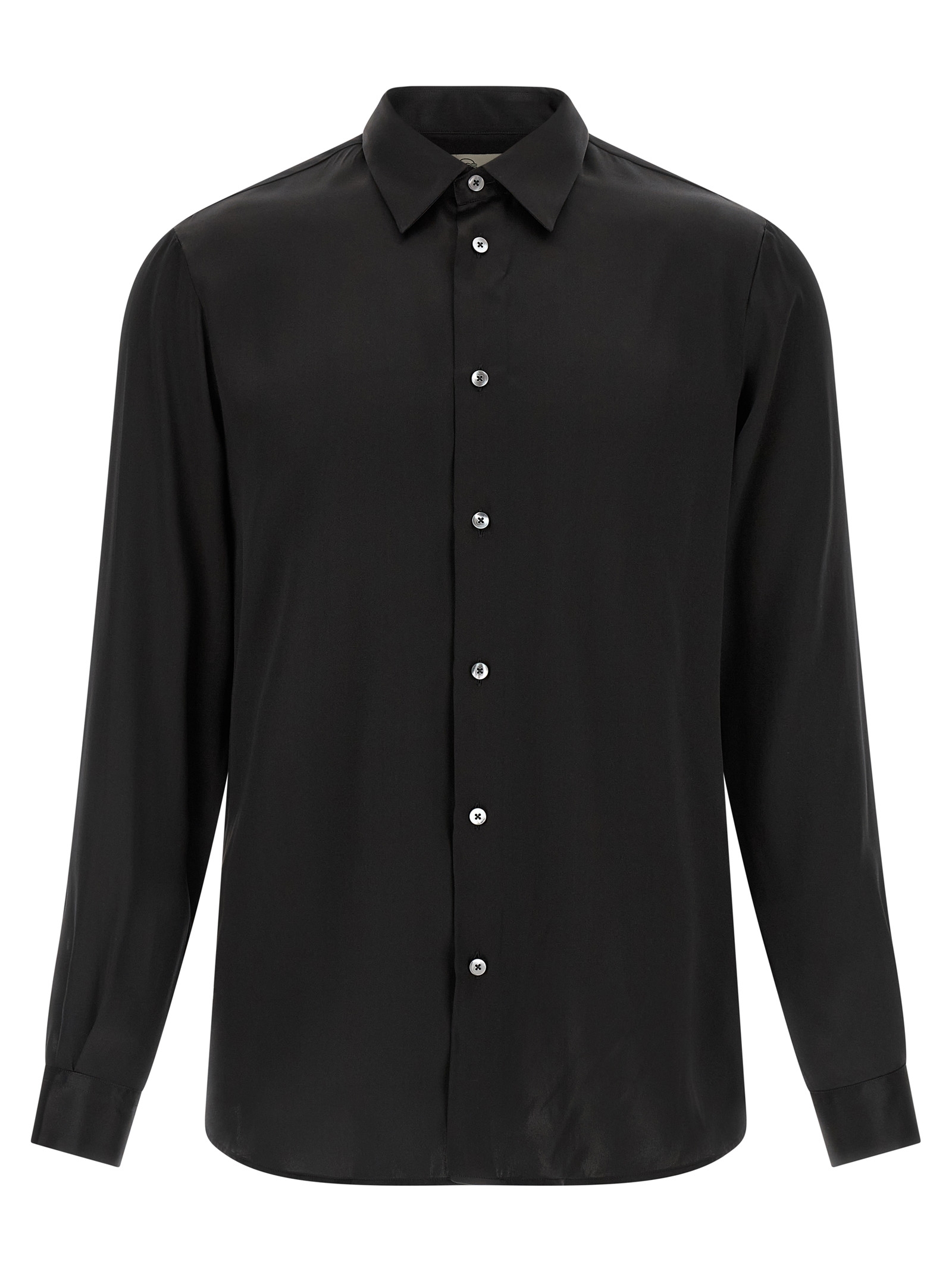 Shiny silk shirt with pointed collar, front mother-of-pearl button closure, long cuffed sleeves, slightly rounded hem.