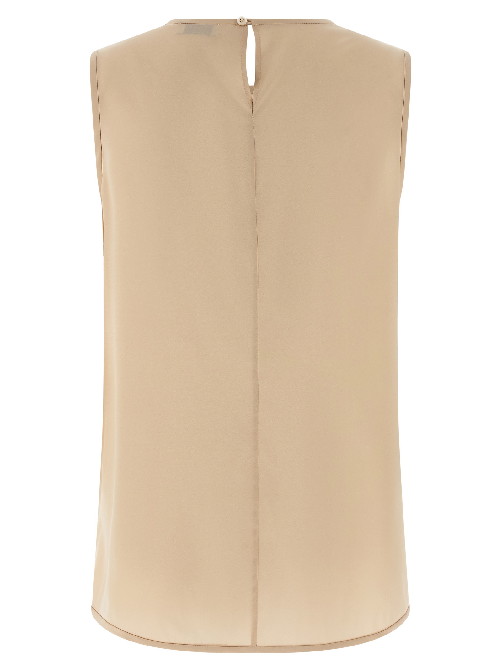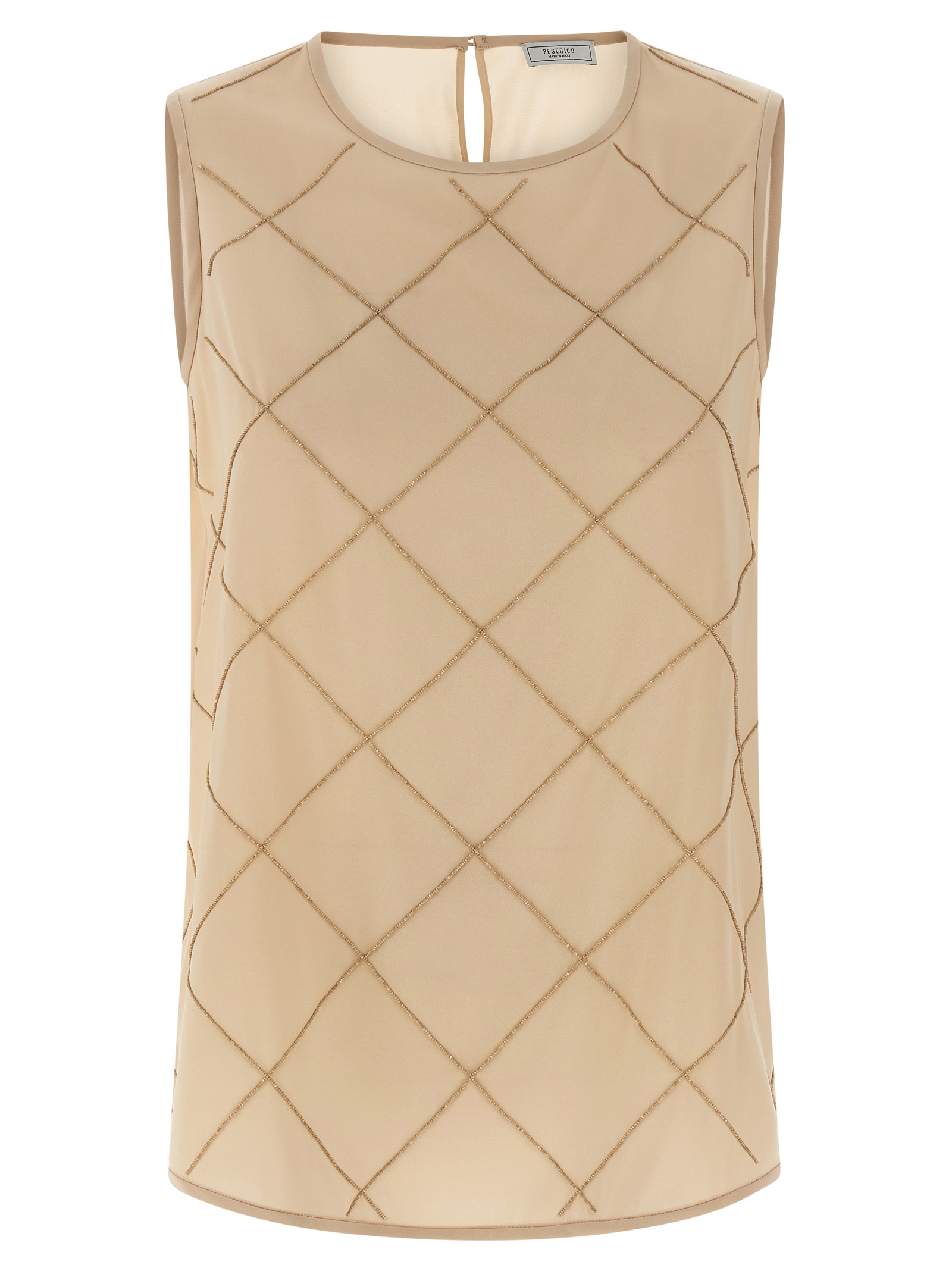Crêpe de chine silk top with geometric front beads appliqué, crew neck, back button closure with teardrop cut-out detail.