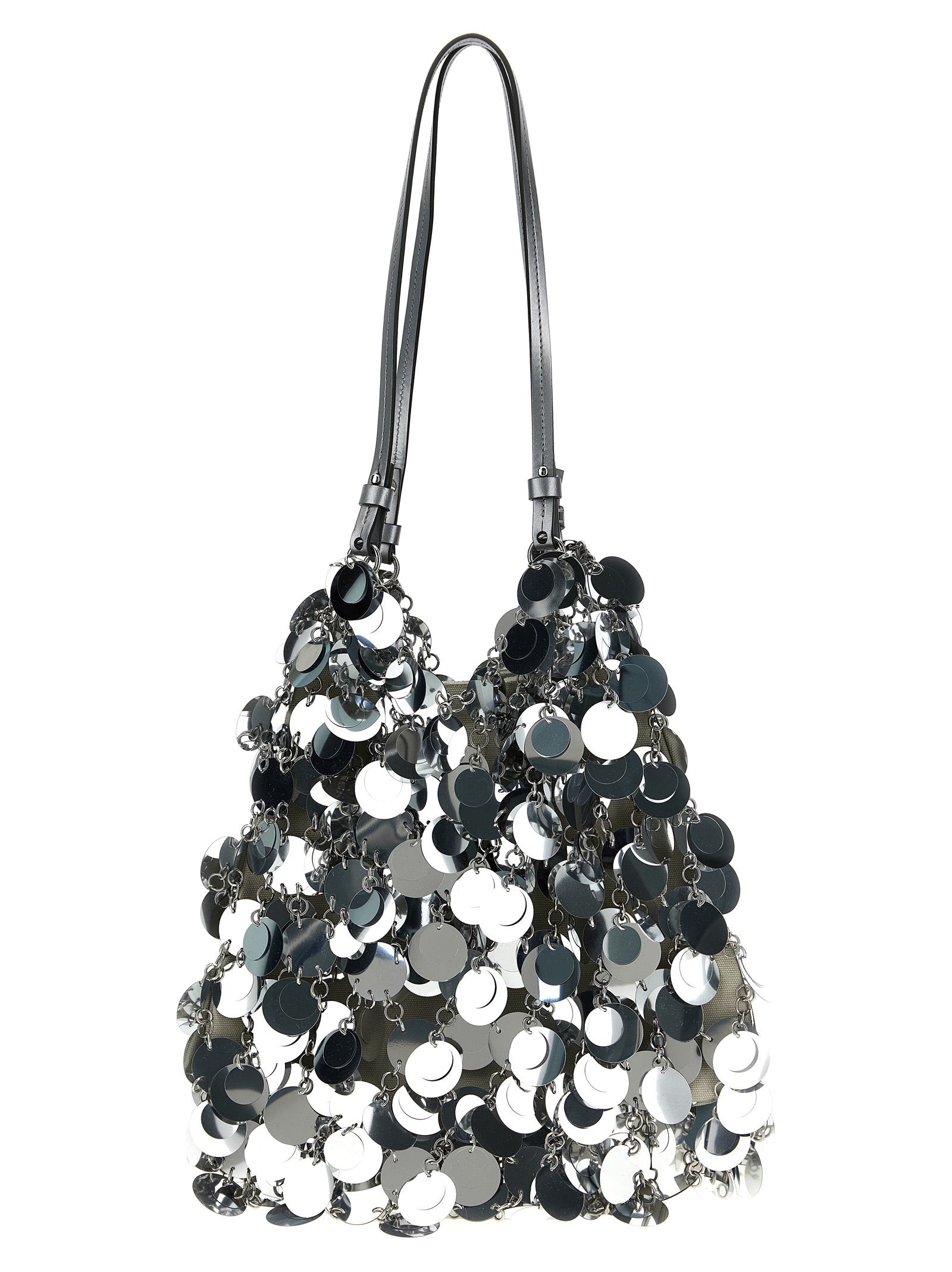 ‘Silver Sparkle Discs Large’ shoulder bag covered with sequins, canvas lining, double leather handle.