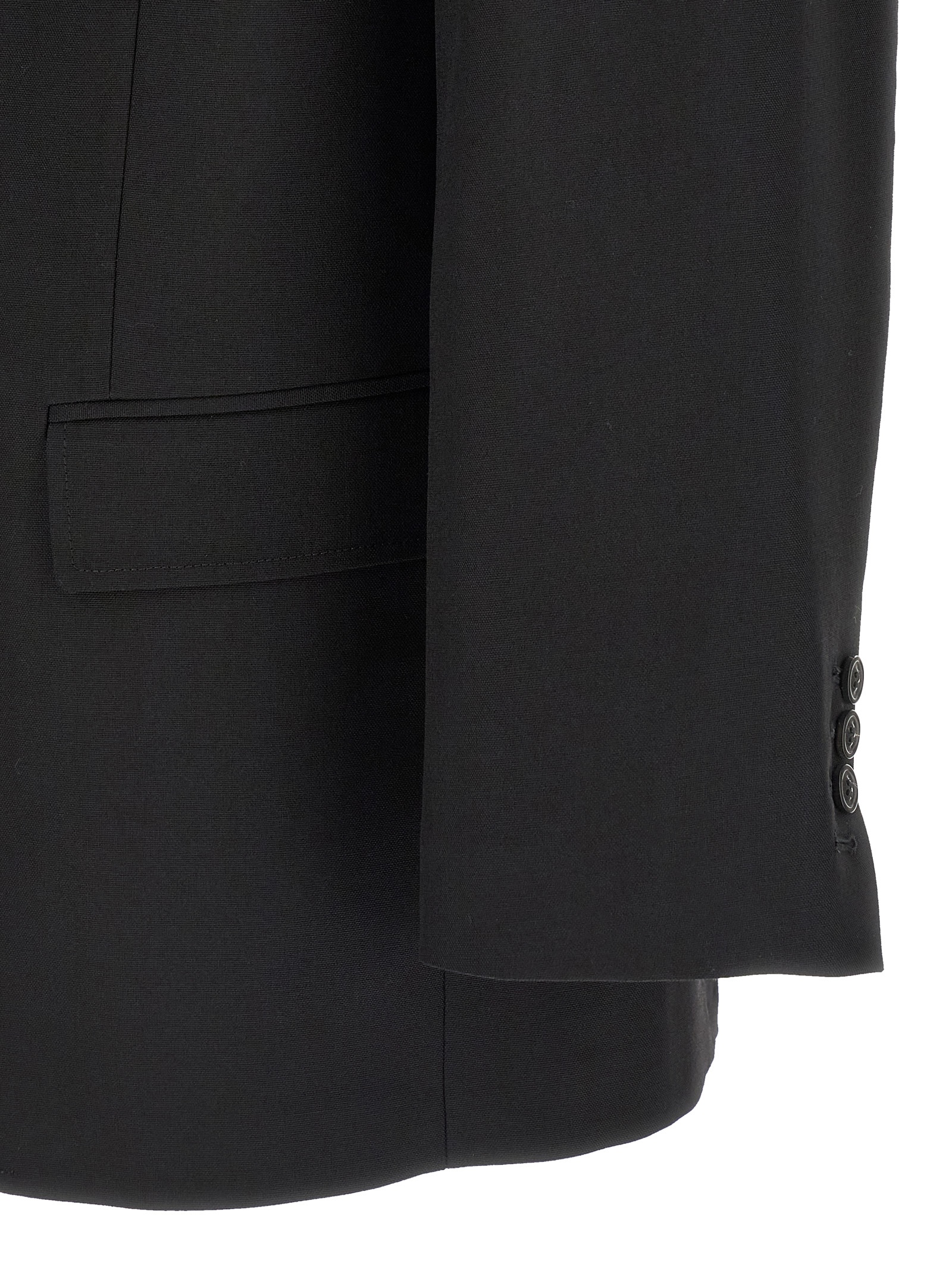 Single-breasted wool blazer, structured line interrupted on the shoulders, raw-cut elements, traditional mirror lapels, front button closure, ‘Four stiches’ logo detail at the back, long sleeves with opening buttons.