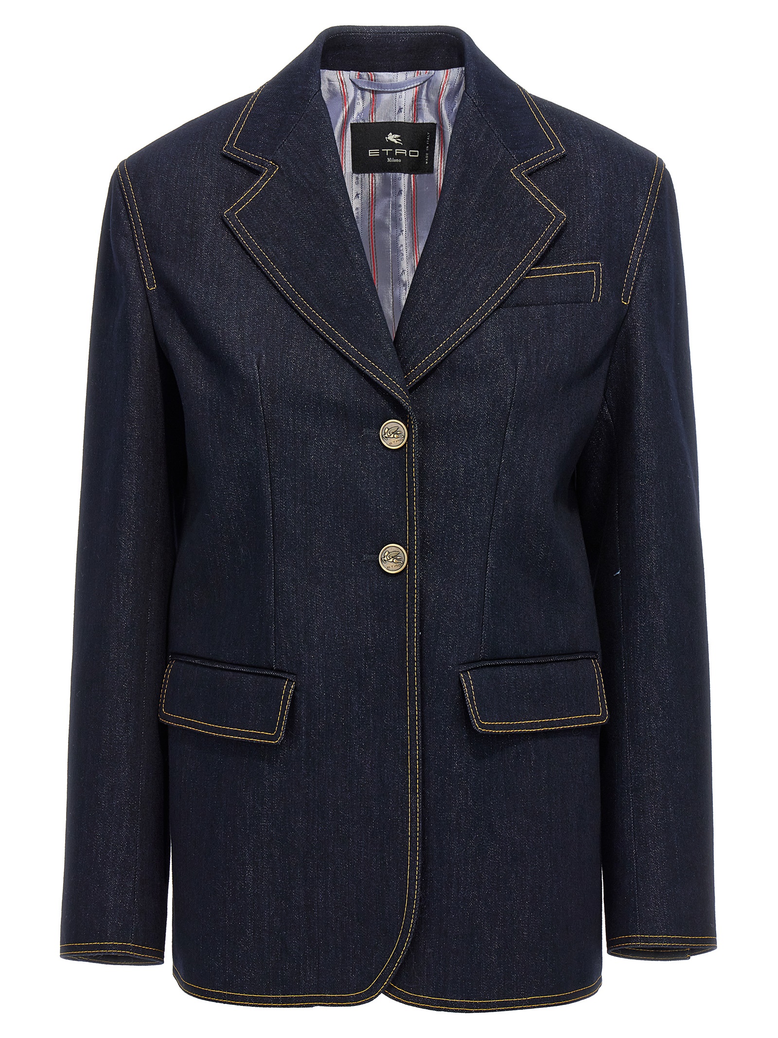 Single-breasted denim blazer with button closure, pockets, long sleeves, padded shoulders, back split.