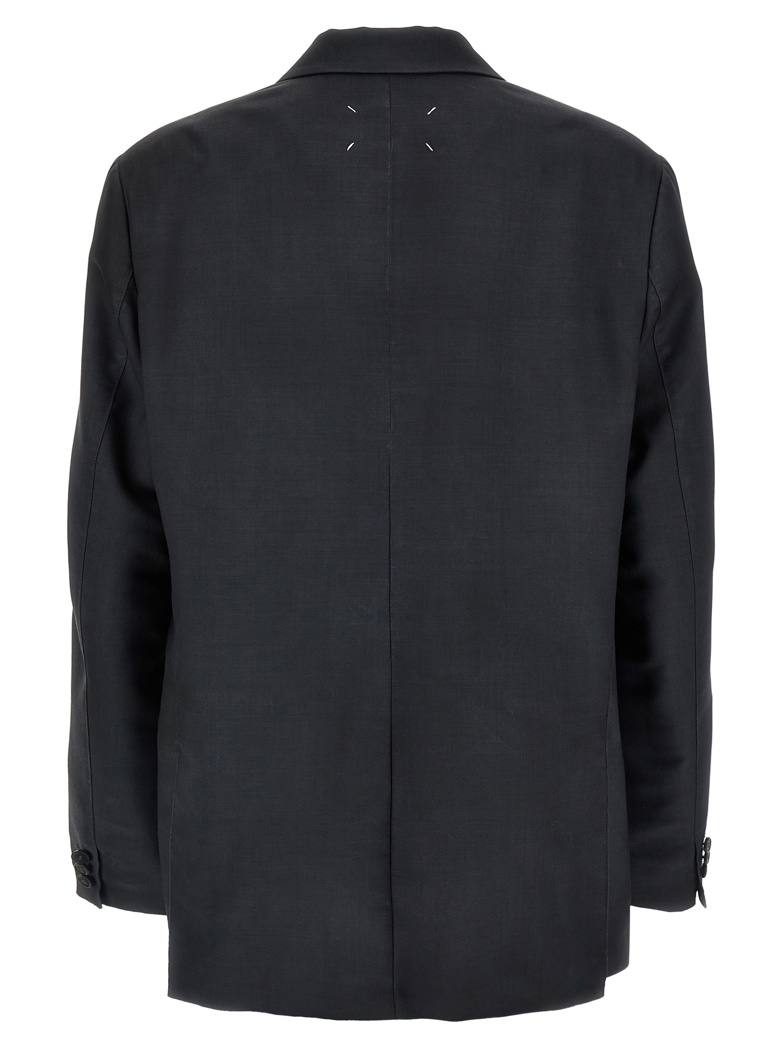 Single-breasted blazer in wool and mohair blend, mirror lapels, button closure, long sleeves, pockets.