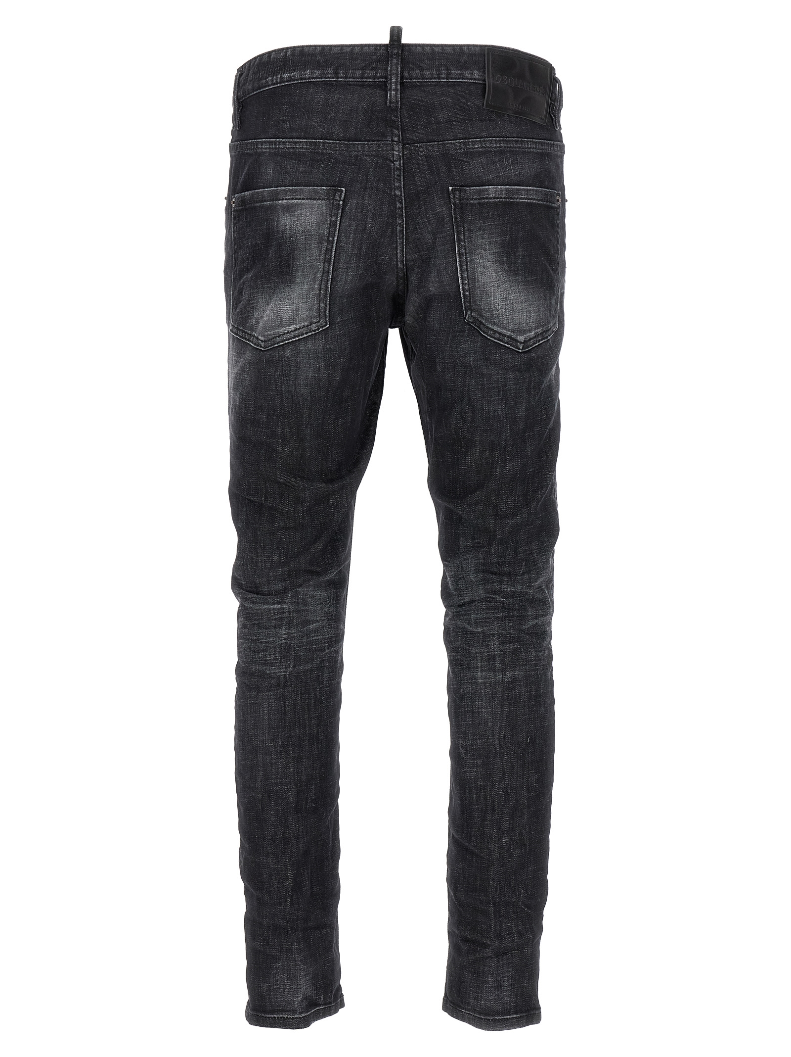 ‘Skater’ stretch cotton denim jeans with used-effect details, button closure, five leather logo pockets.