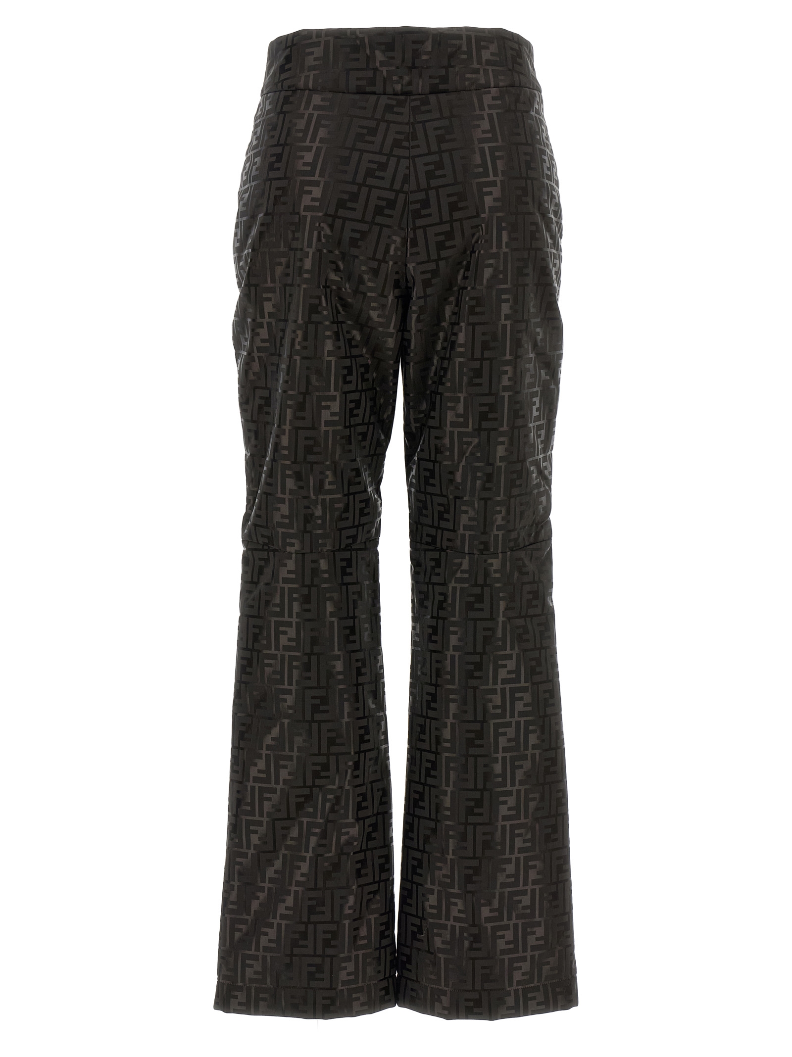 Ski pants in technical fabric with ‘FF’ pattern, high waist, tight fit, front stitching, front zip closure, side zip on the leg bottom.