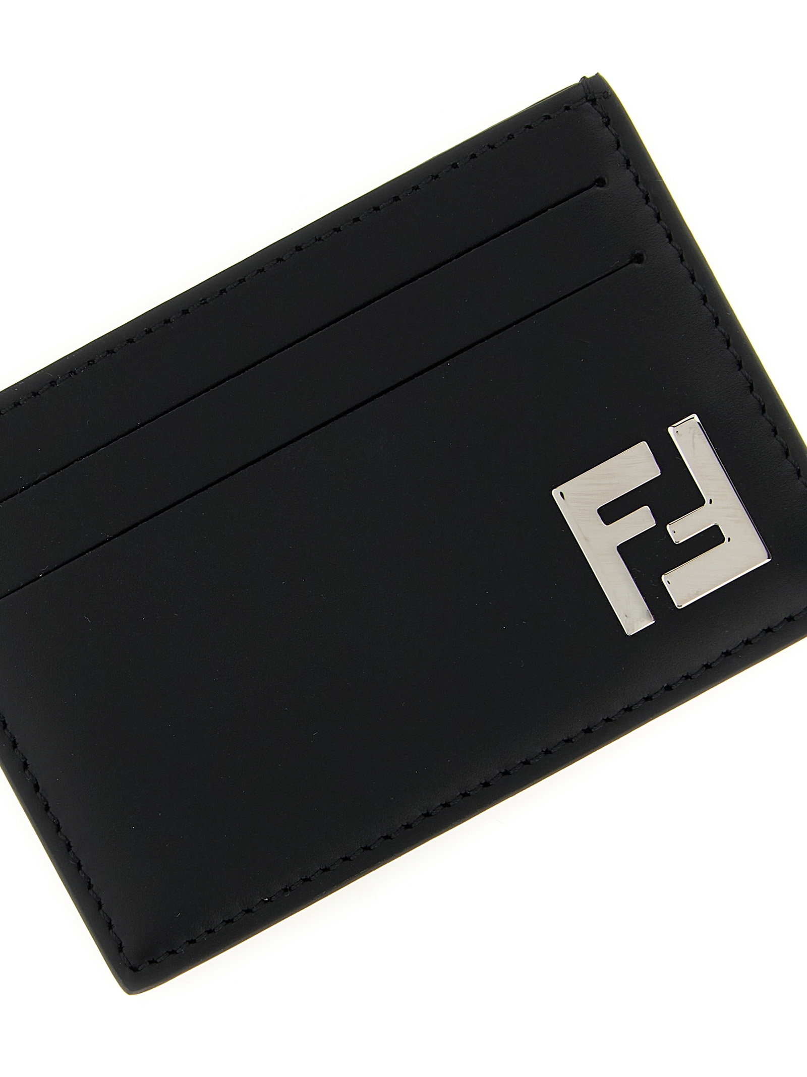 ‘Slim Squared FF’ leather card holder with metal logo on the front.