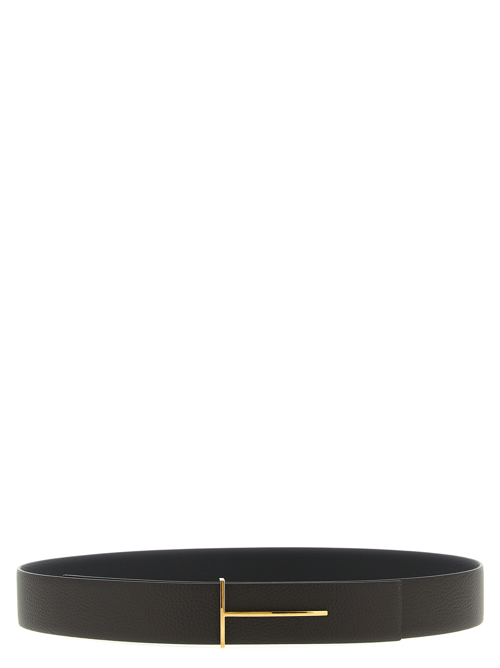 Reversible belt in soft hammered leather, adjustable with ‘Slim T’ metal buckle with gold trim.