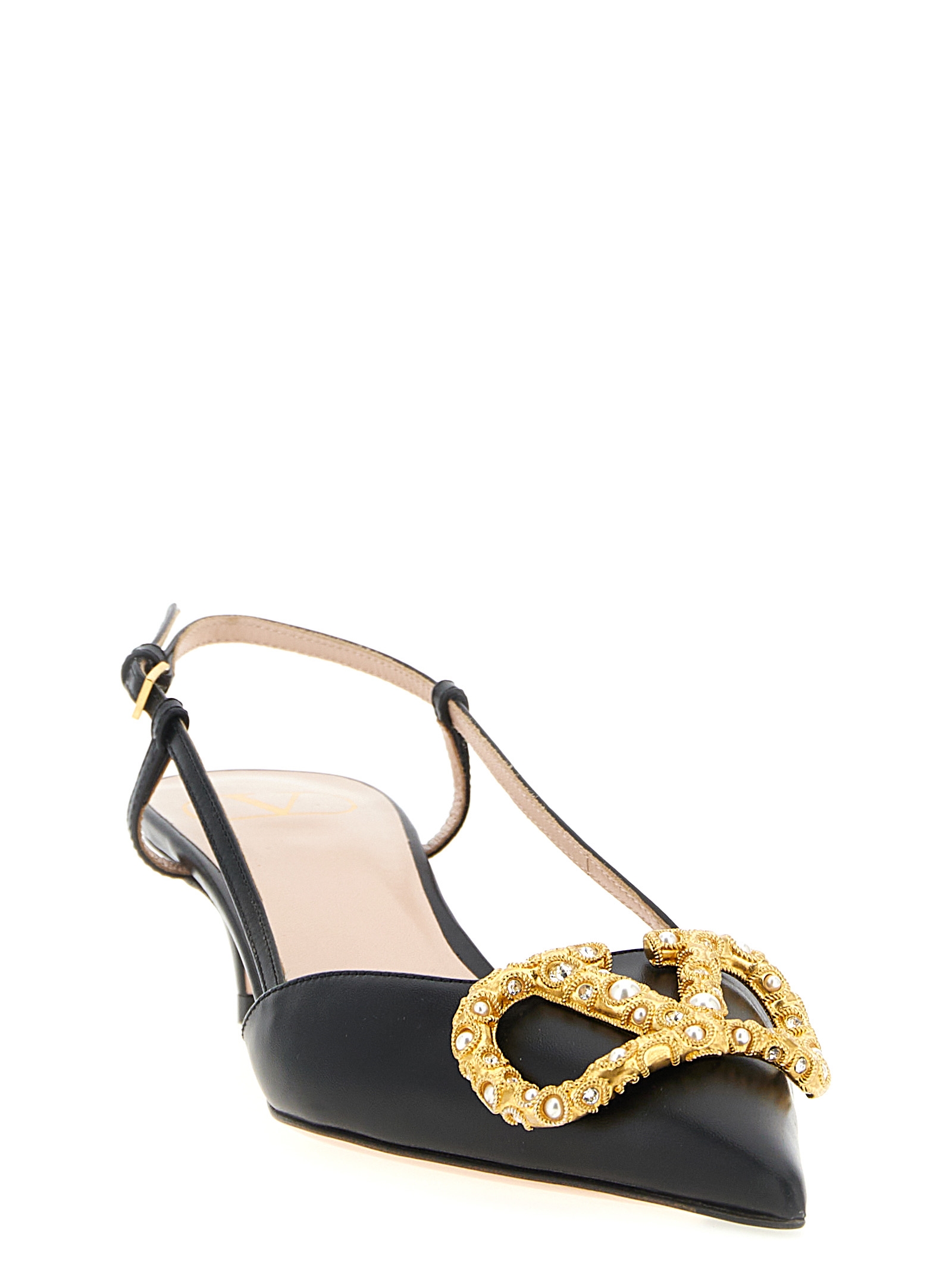 Smooth calf leather slingbacks, pointed toe with VLogo Signature jewel on the front, adjustable strap, heel, leather sole.