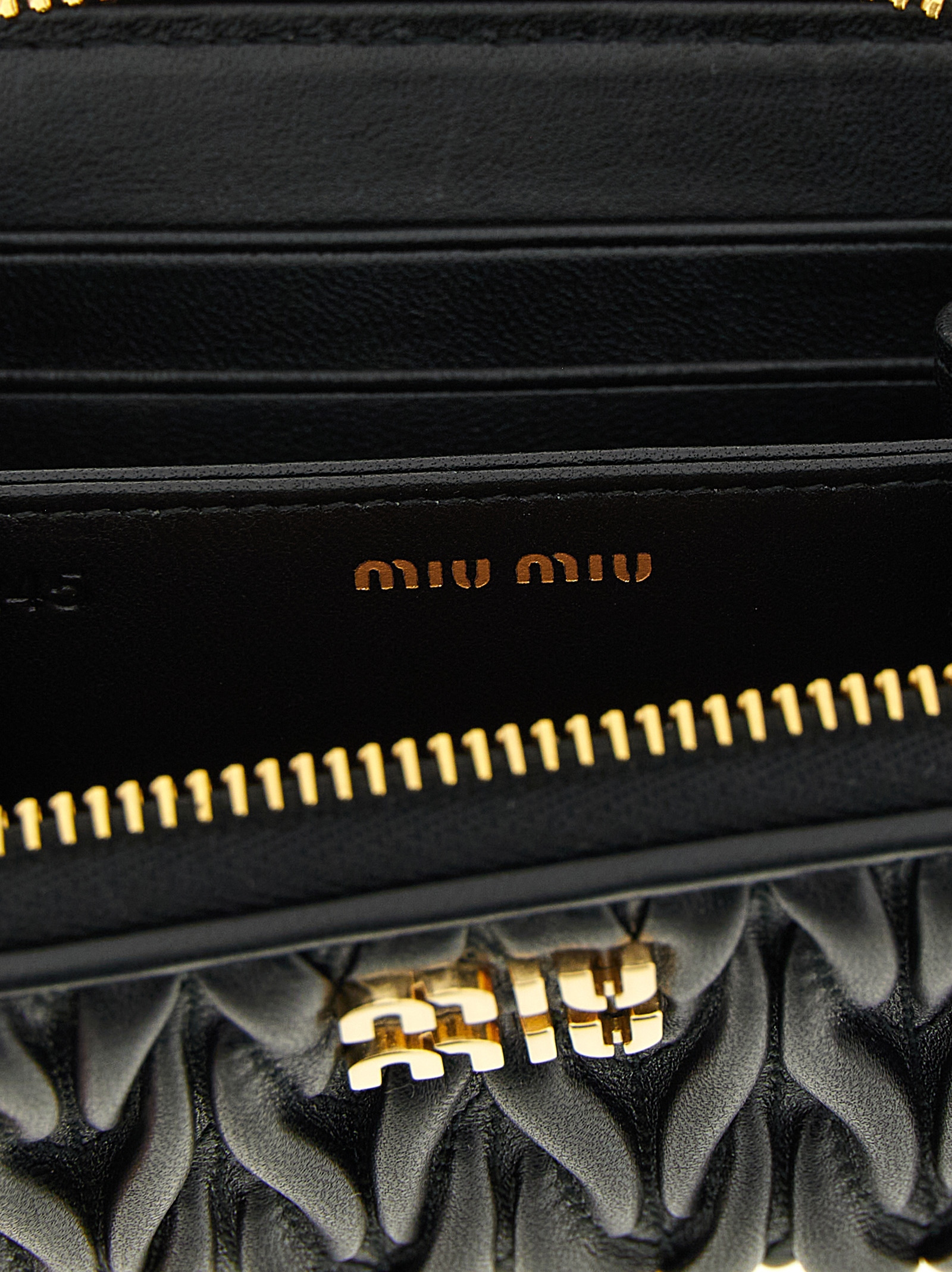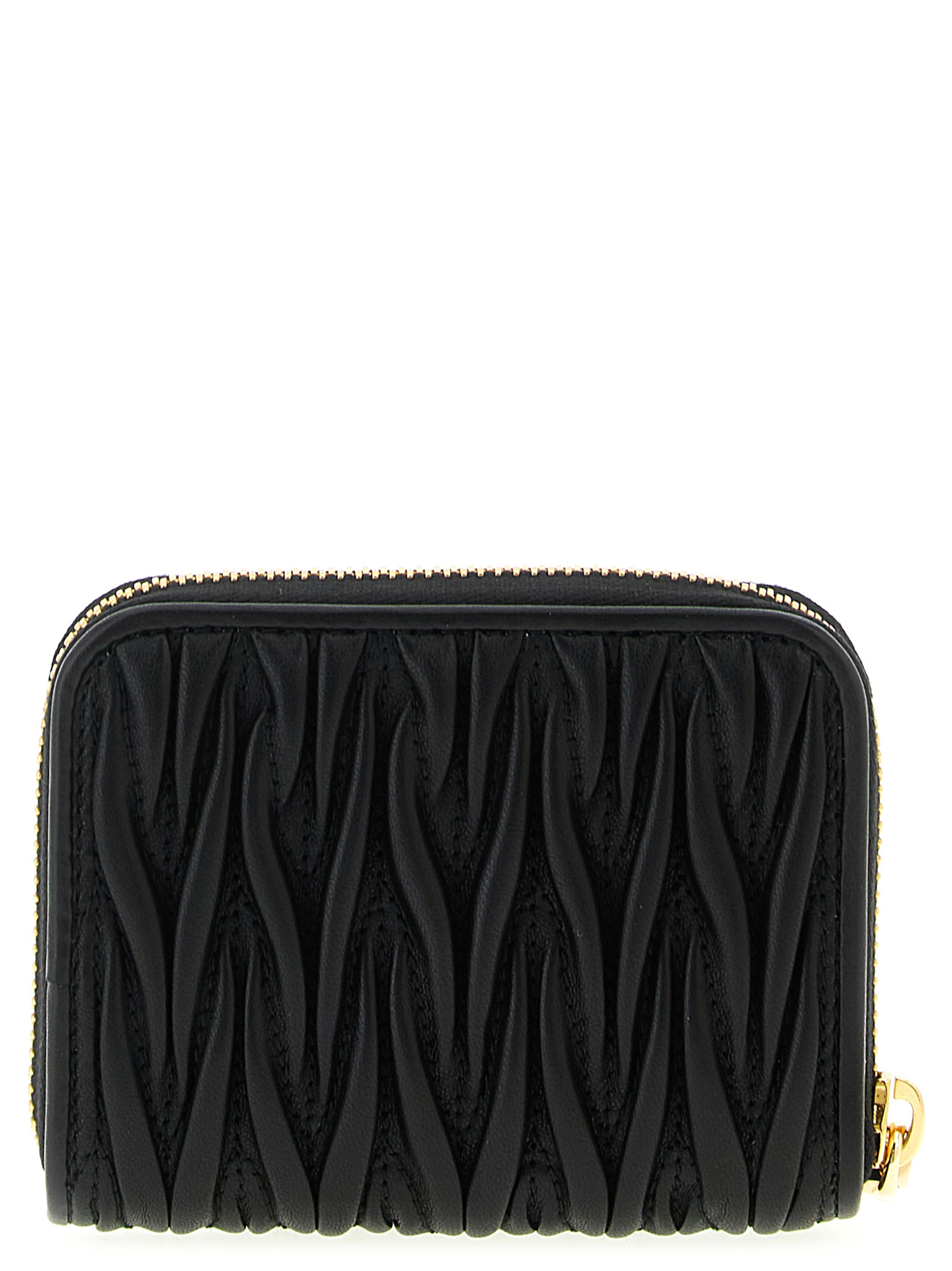 Small wallet in matelassé nappa leather, front metal lettering logo, zip-around closure, moiré and leather lining.