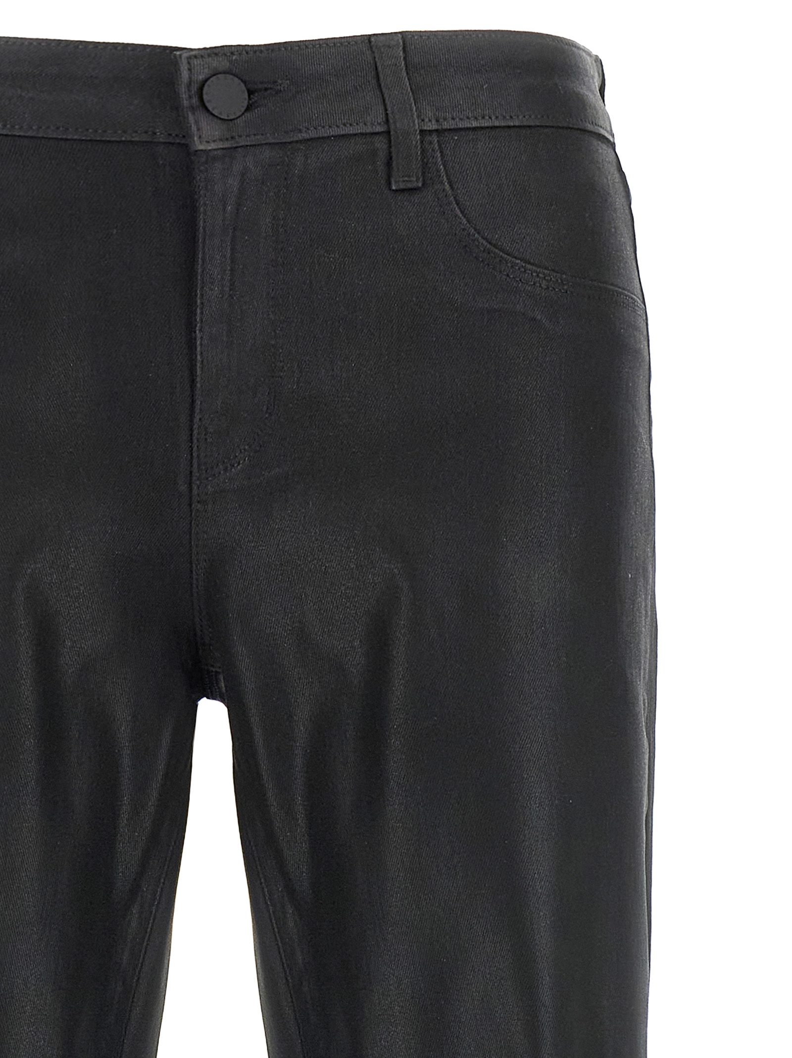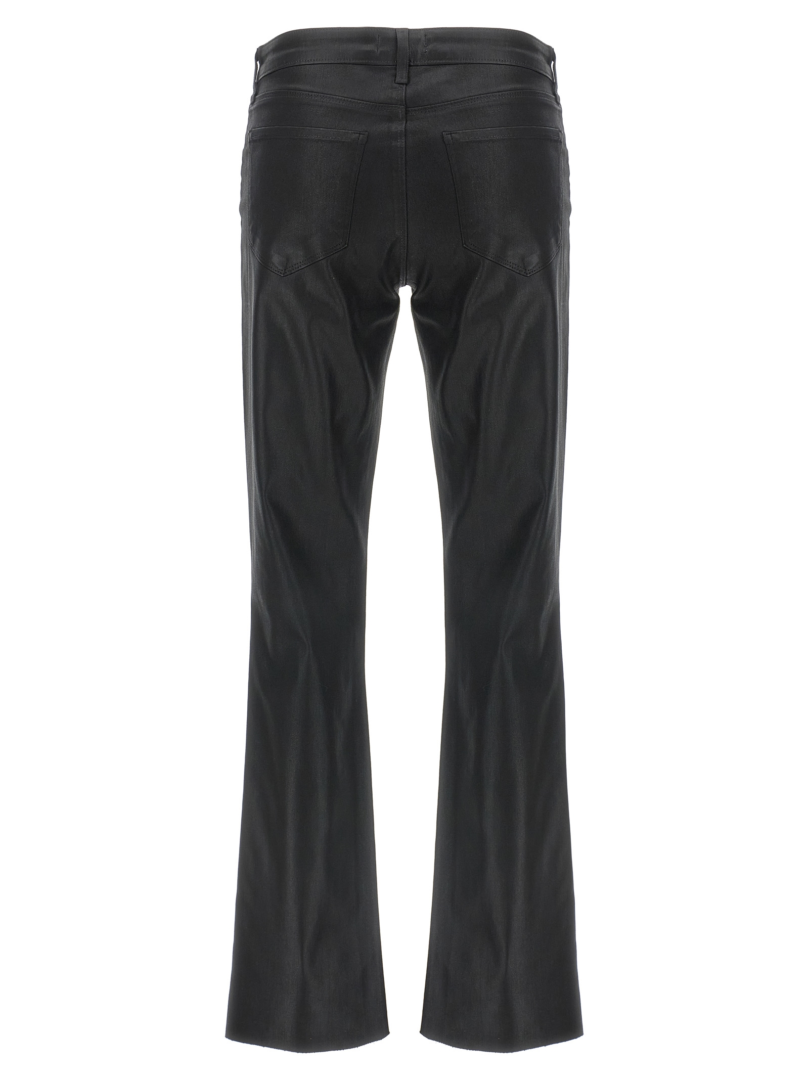 ‘Sneeki’ coated denim jeans, low waist, flared leg, zip and button closure, front trompe l’oeil pockets, functional back pockets.