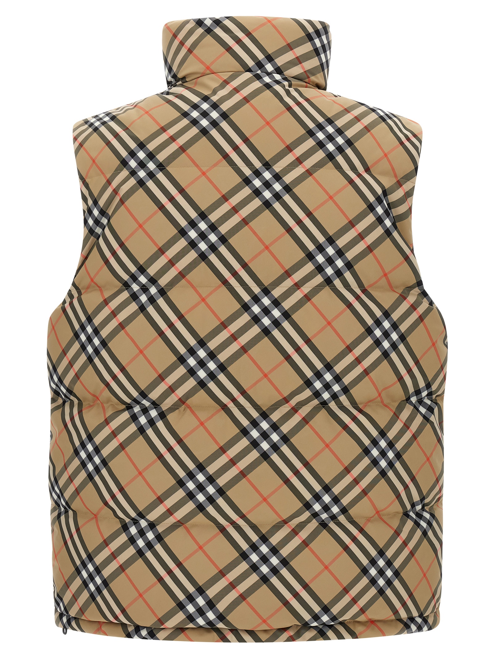 ‘Snowshill’ reversible vest in Burberry Check fabric and solid quilted nylon with goose down padding, silicone ‘Equestrian Knight Design’ patch and front zip closure, standing collar, pockets, drawstring at the hem.