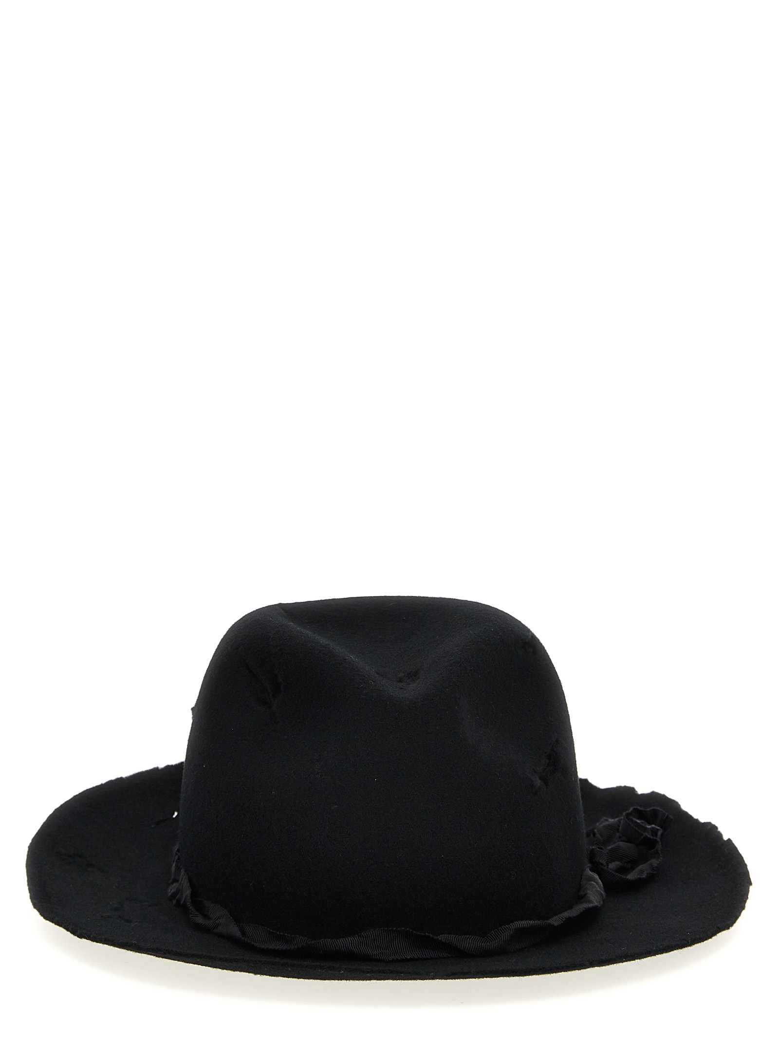 Soft’ hat in used-effect wool with rips, tone-on-tone grosgrain ribbon.