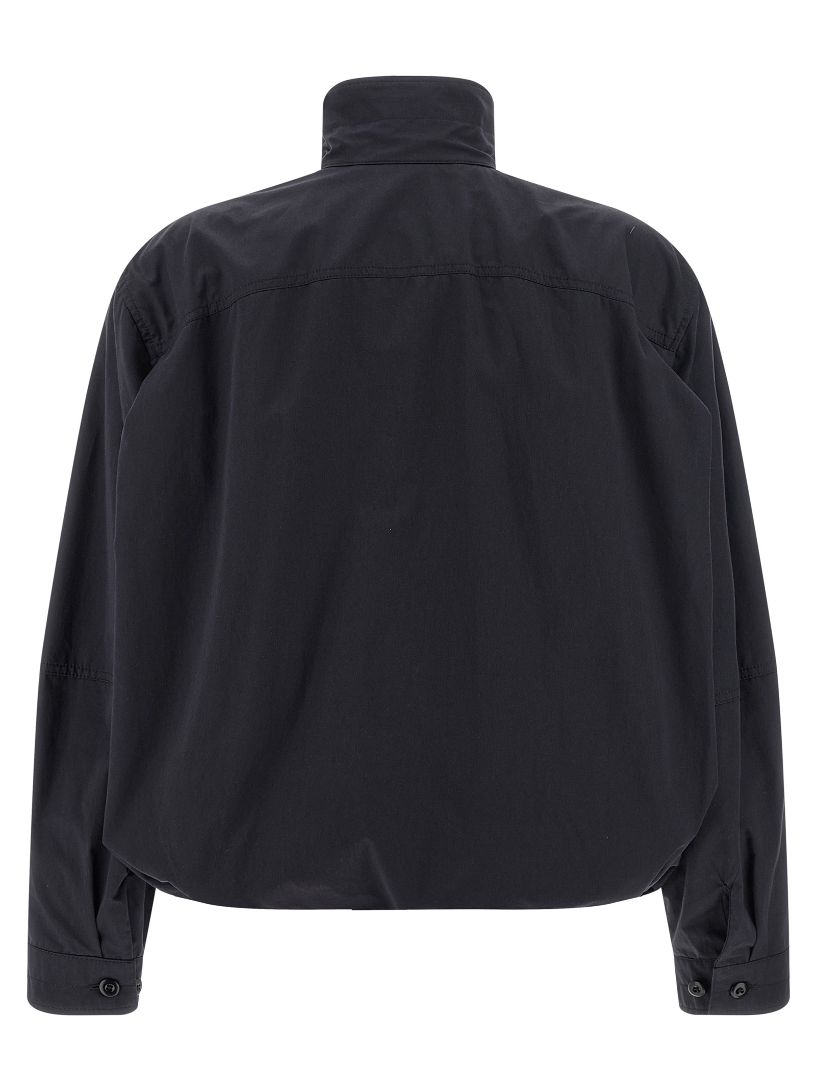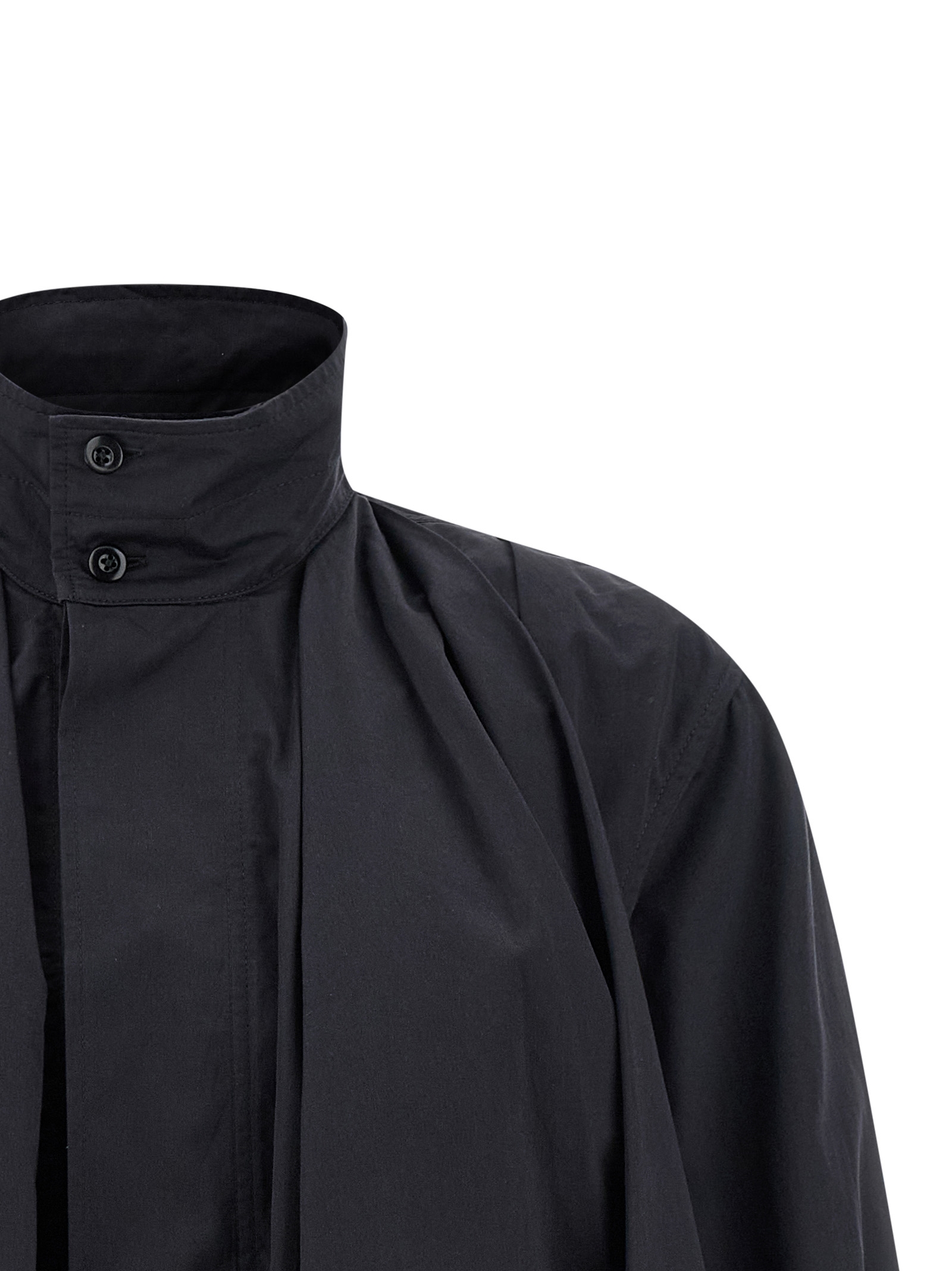 ‘Soft Pleated’ pleated jacket in lightweight cotton satin with front draped effect, structured silhouette with curled hem on the hem, high neck with buttons, hidden front button closure, pockets, long cuffed sleeves.