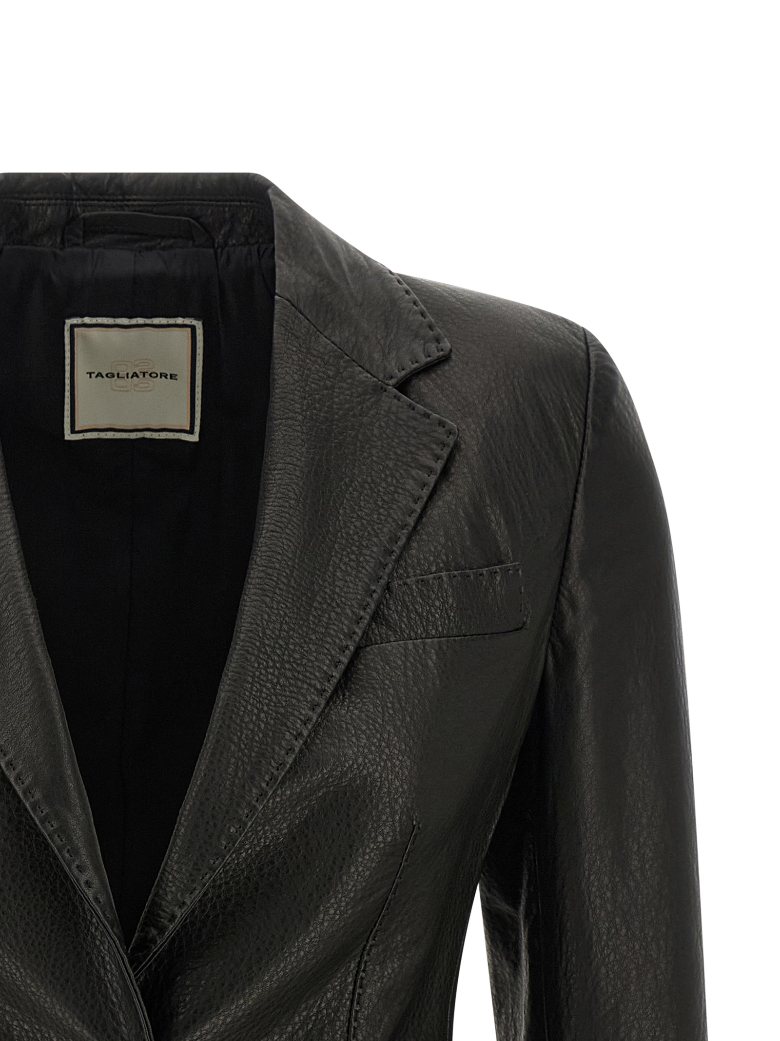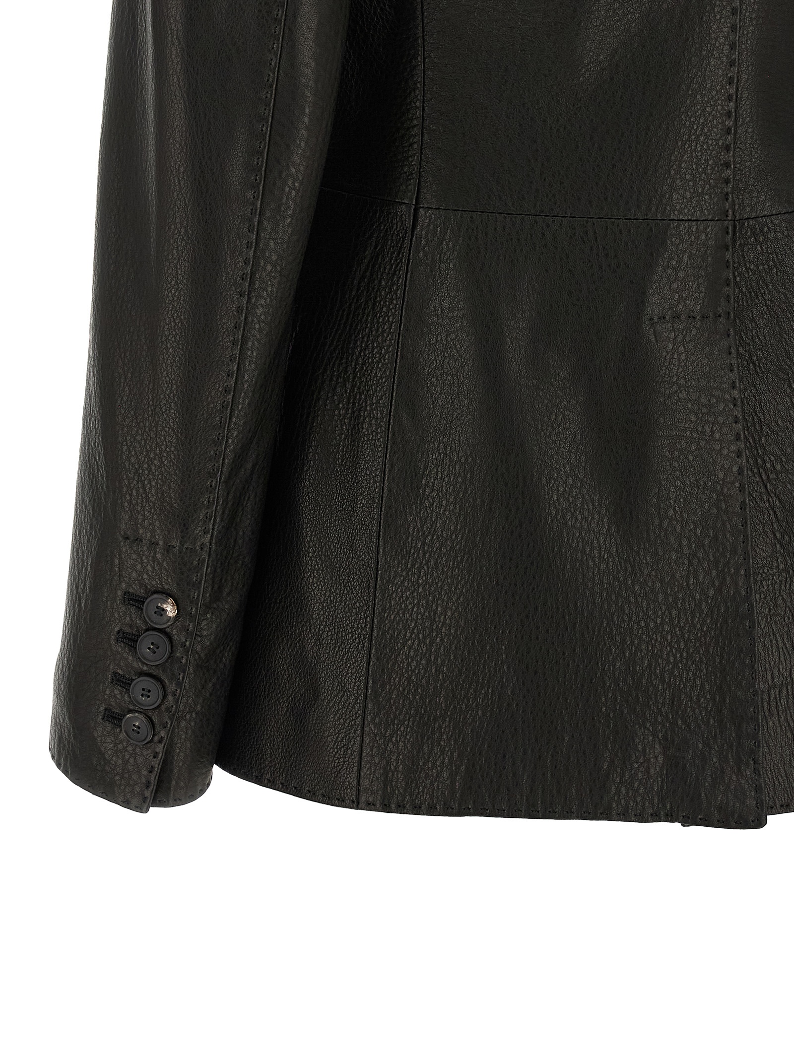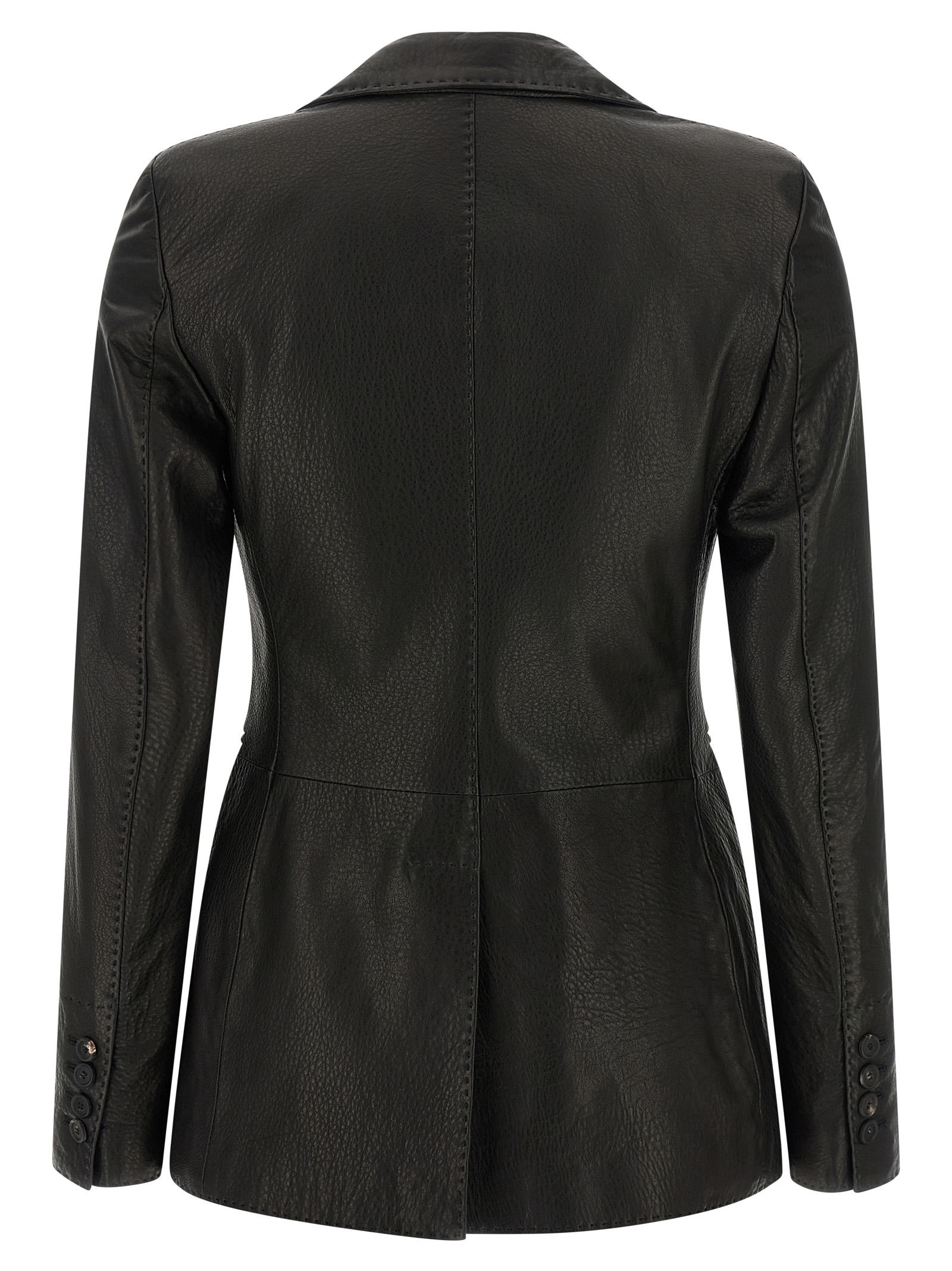 ‘Sophie’ hammered leather single-breasted blazer with tone-on-tone stitching, two front horn button closure, mirror lapels, breast pocket, flap pockets, structured shoulder strap, long sleeves, back split, cupro blend lining.