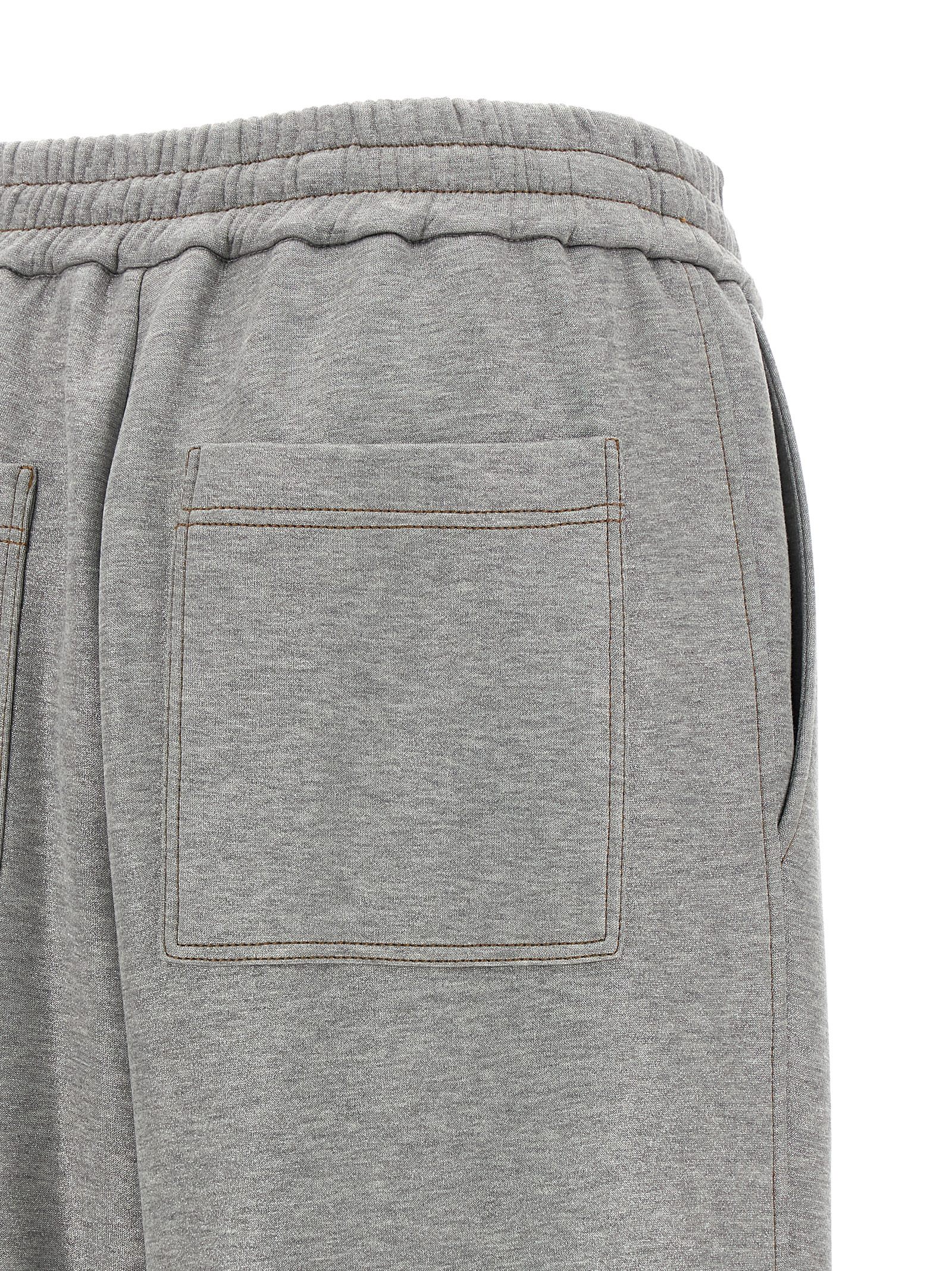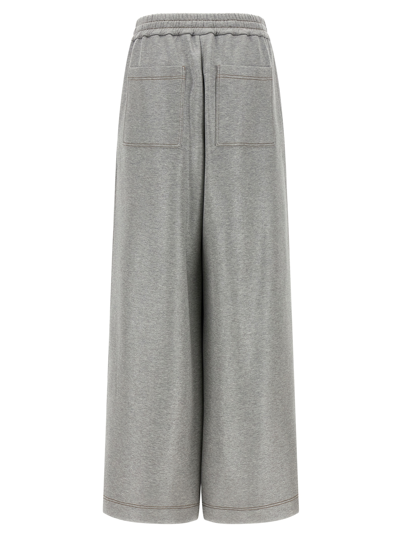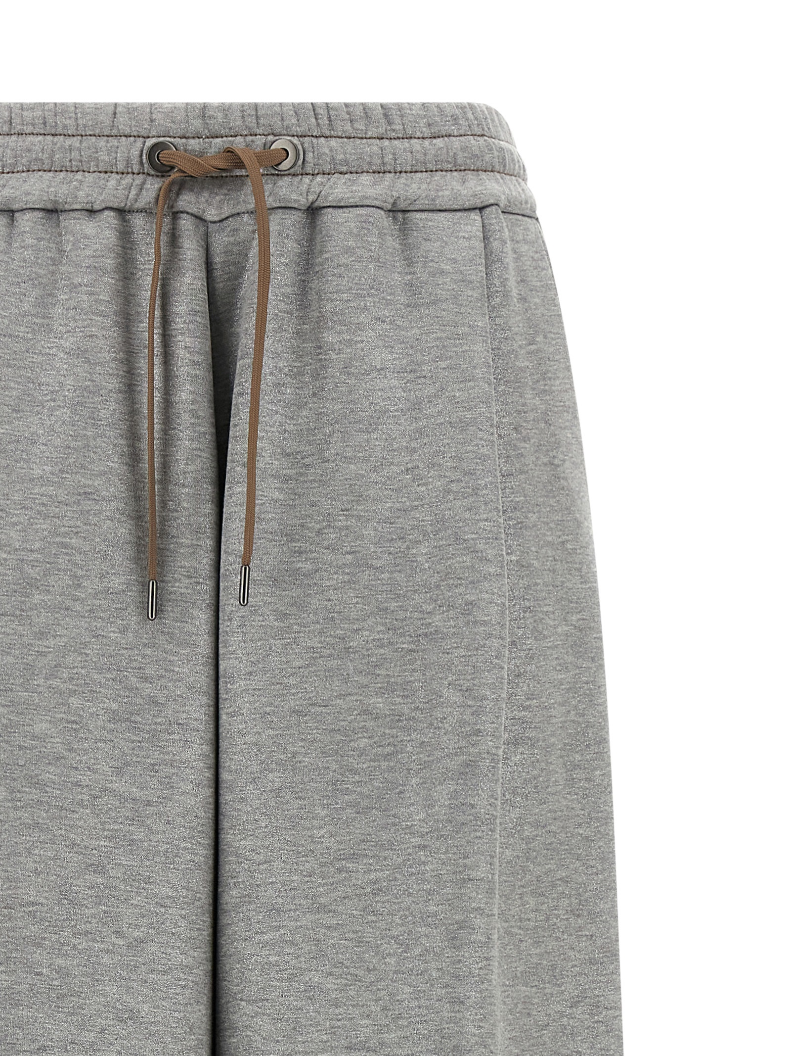 ‘Sparkling’ mélange cotton blend joggers with lamé thread, contrast stitching, wide straight leg, drawstring elastic waistband, pockets.