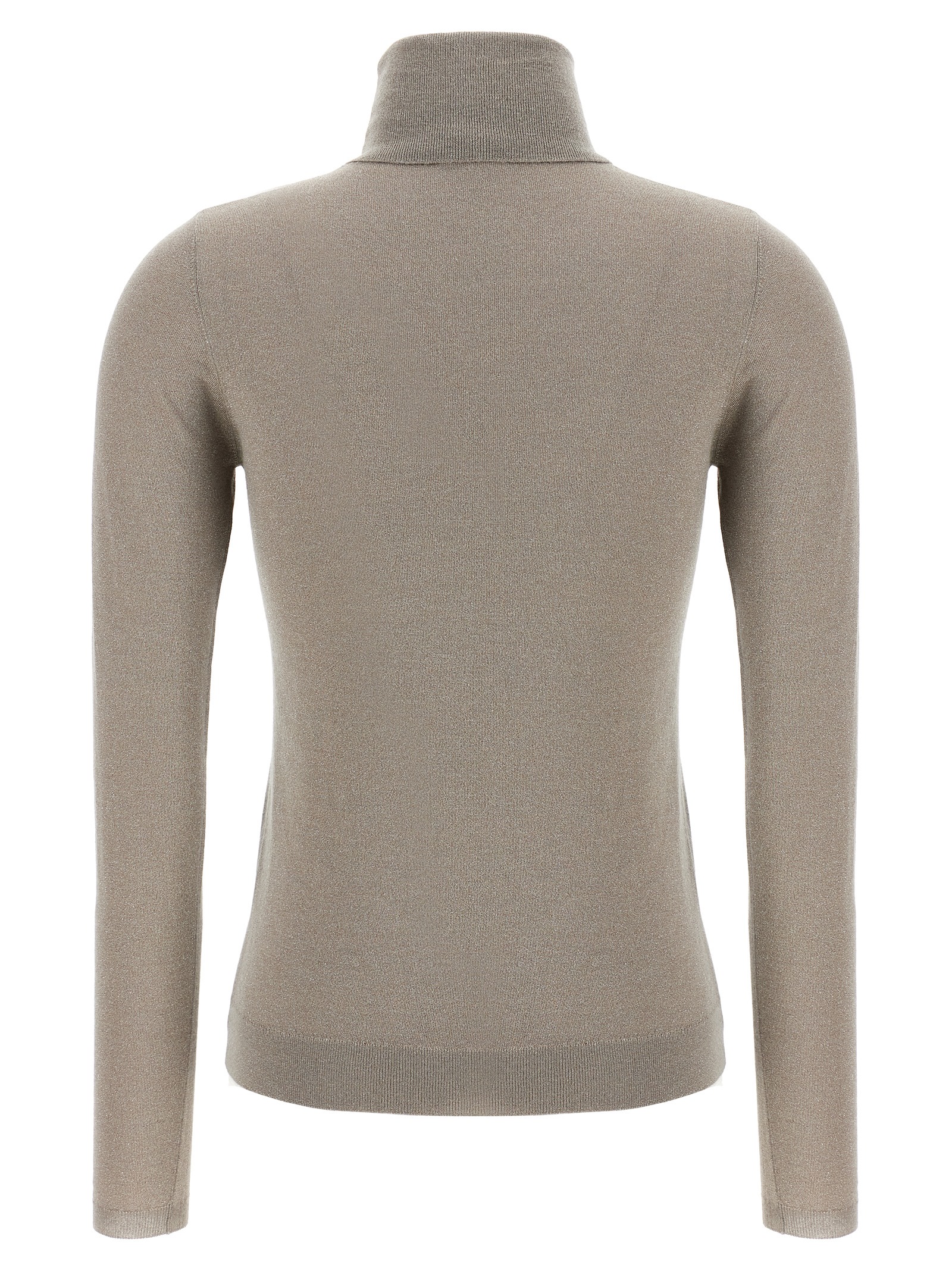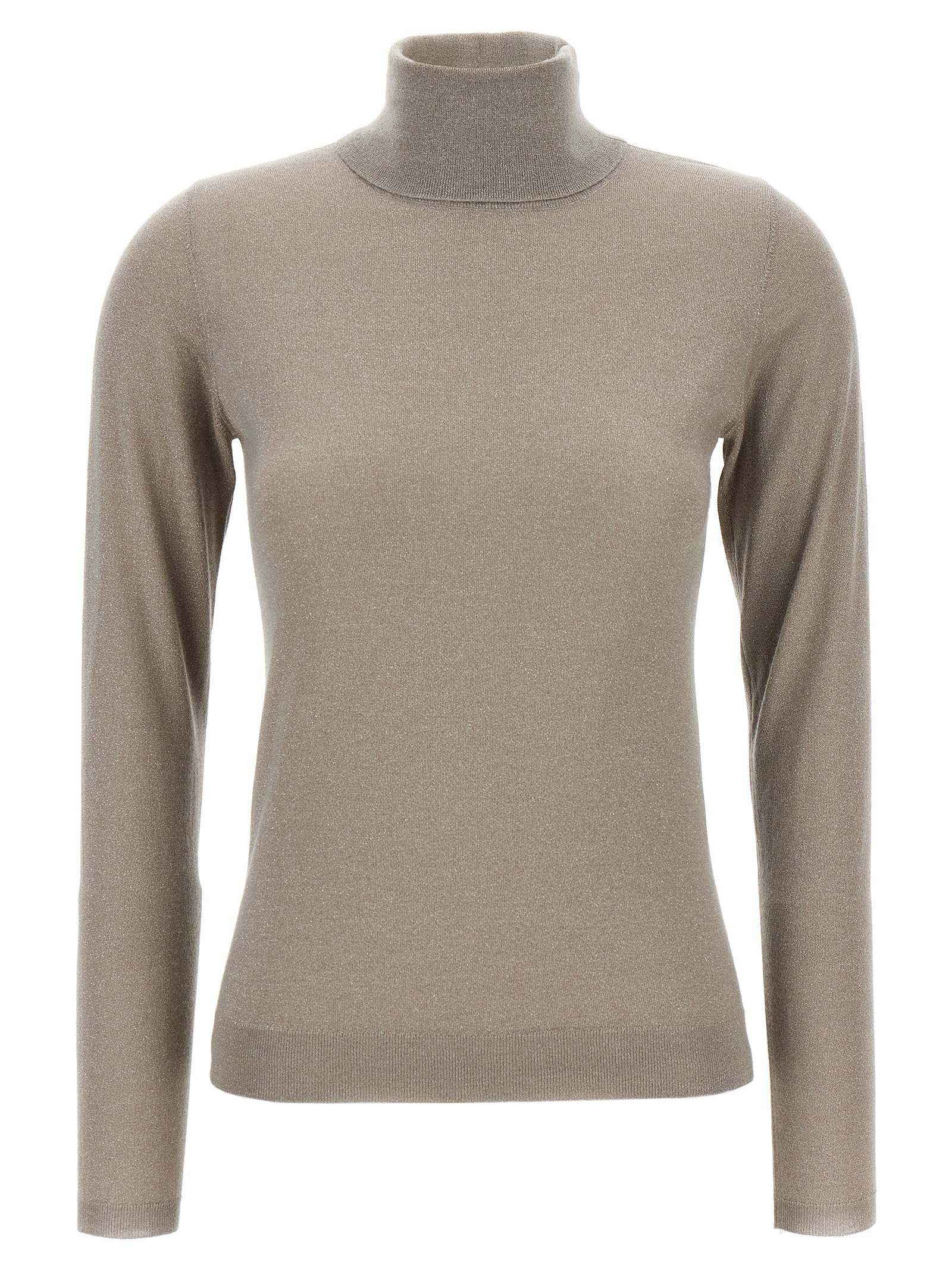 ‘Sparkling’ cashmere and silk blend turtleneck sweater with lamé thread, high neck, long cuffed sleeves.