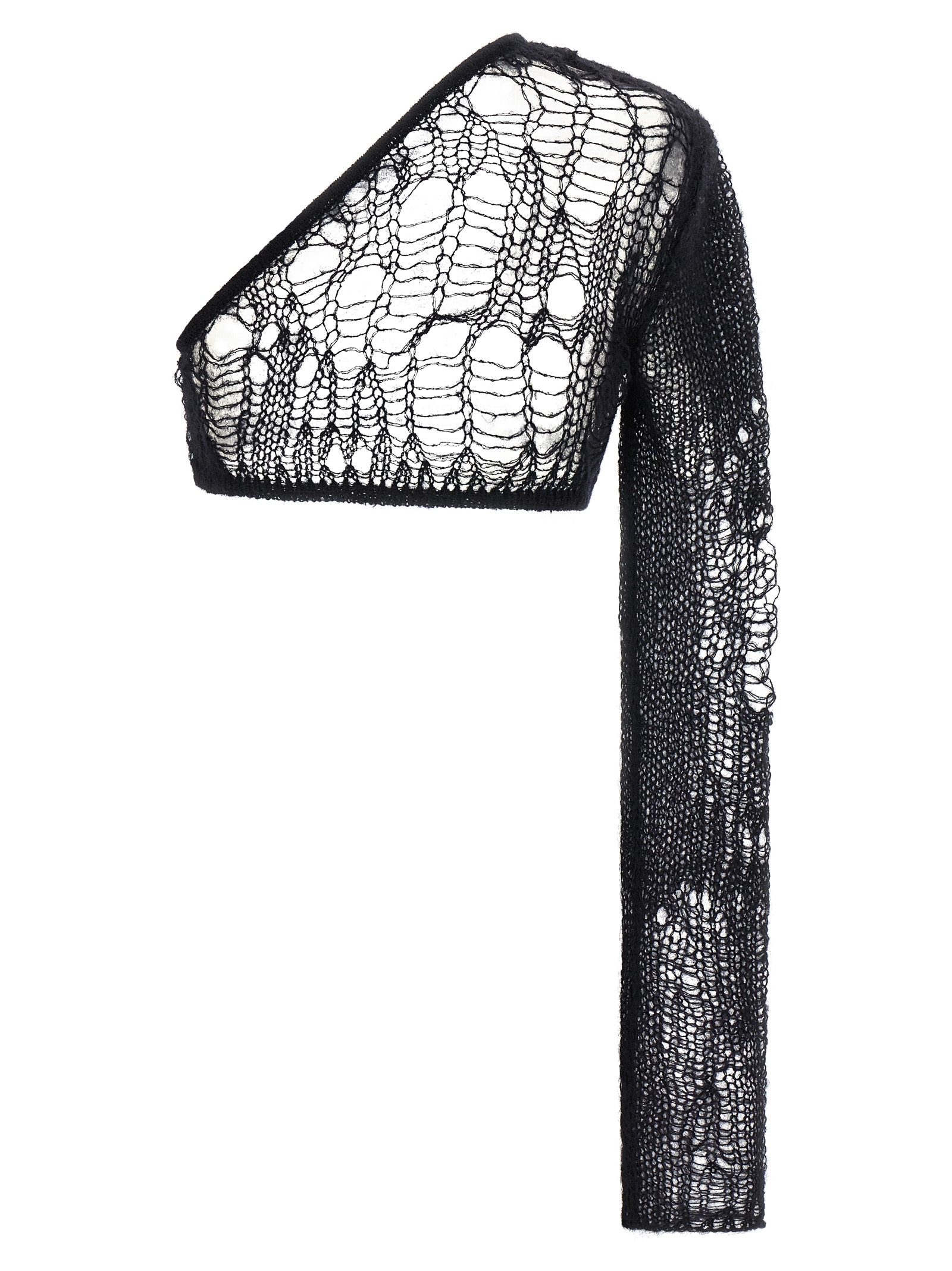 ‘Spider Ziggy’ top in openwork mohair blend, one-shoulder model with long sleeves.