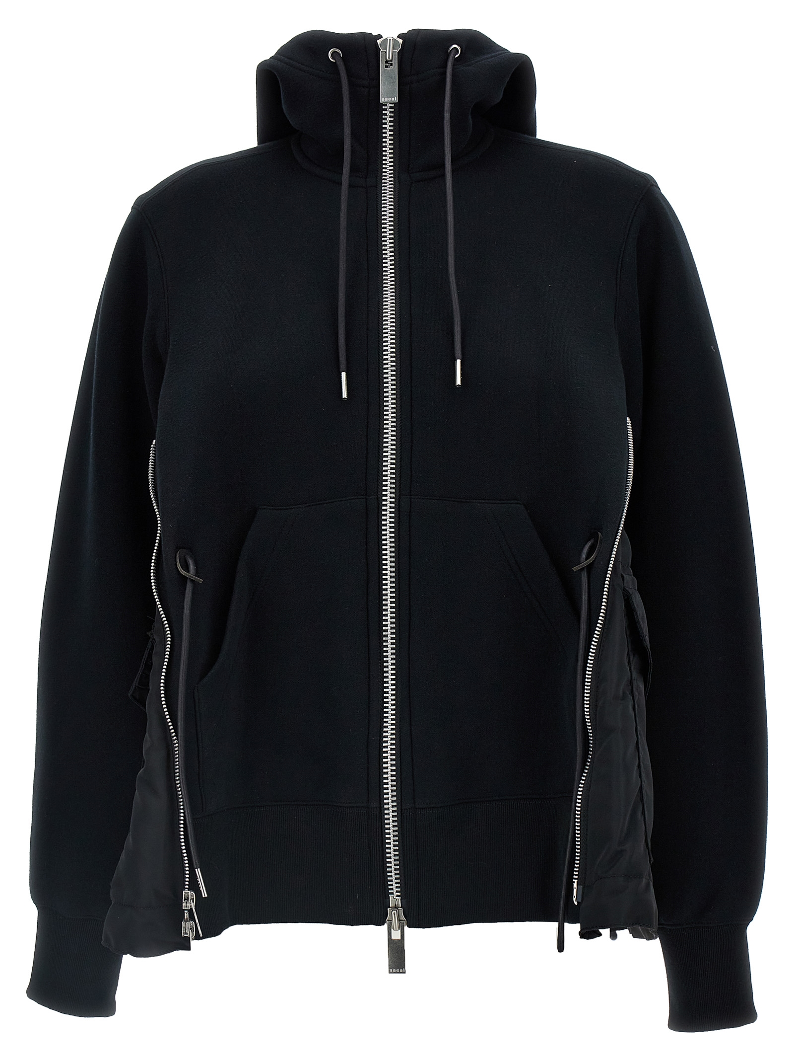 ‘Sponge’ cotton blend hoodie with nylon inserts, zip closure, pockets, long cuffed sleeves.
