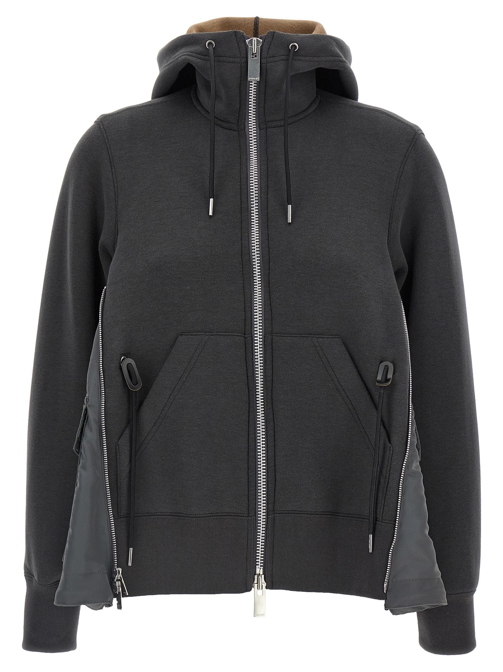 ‘Sponge’ cotton blend hoodie with nylon inserts, zip closure, pockets, long cuffed sleeves.