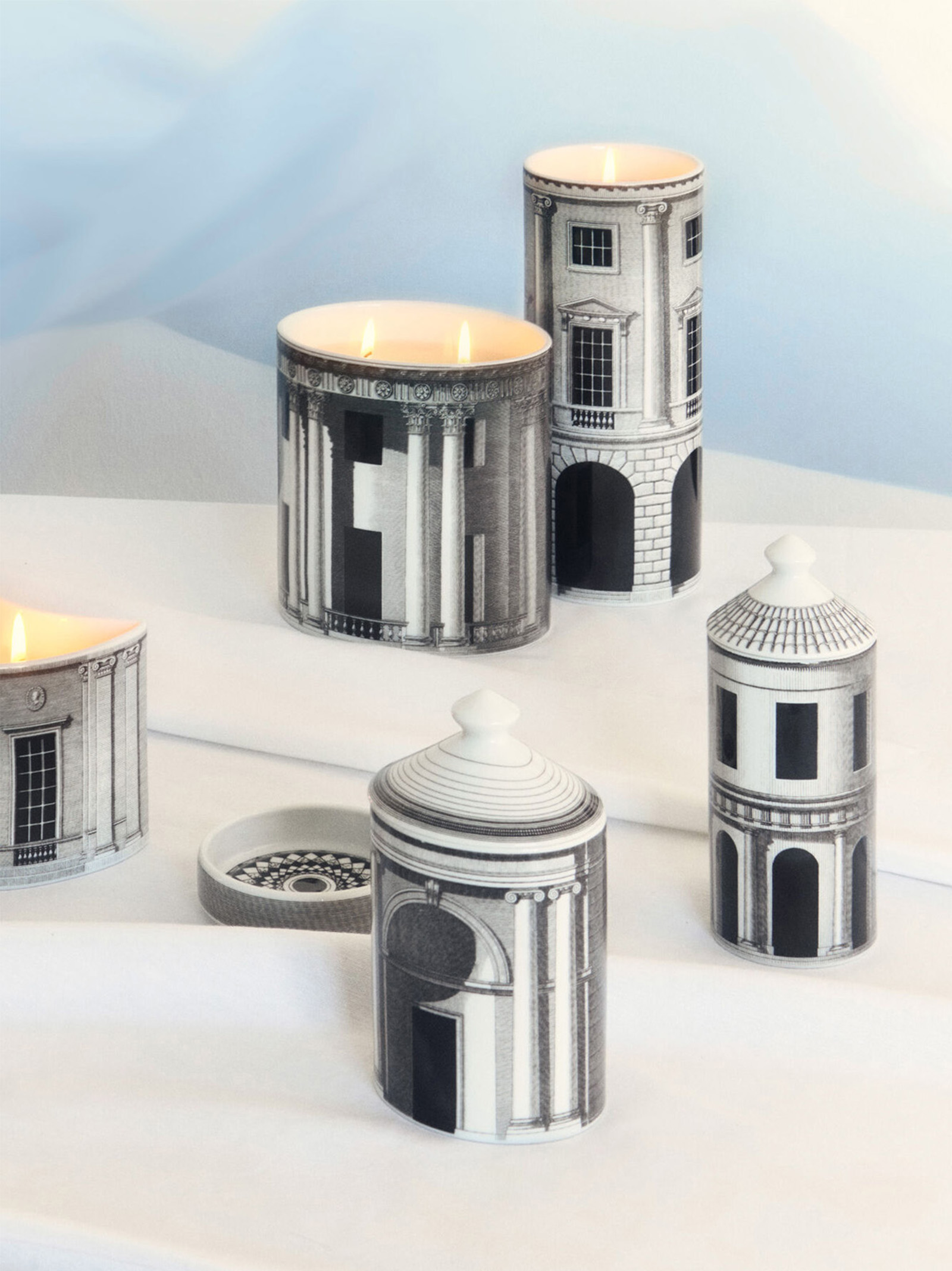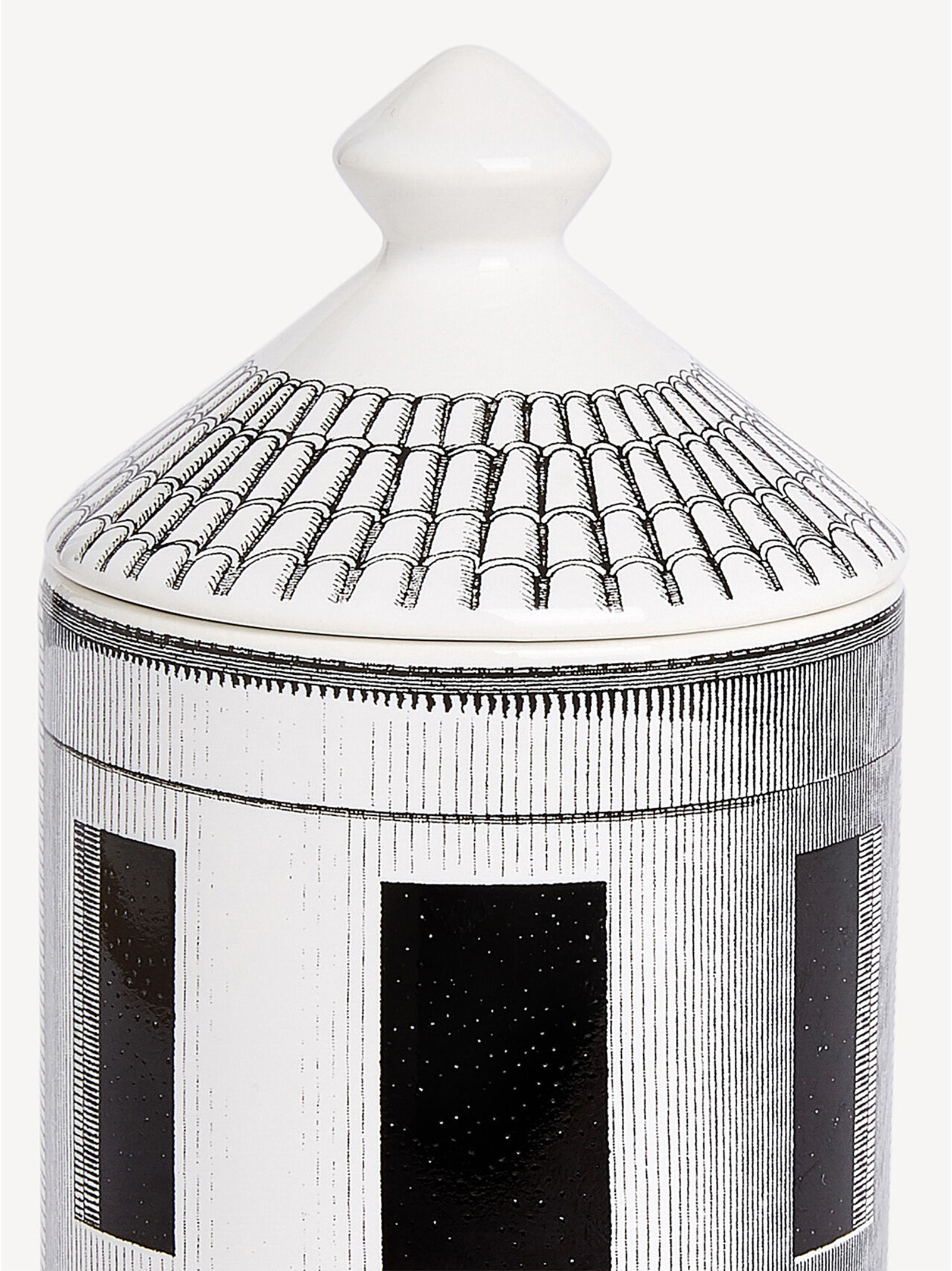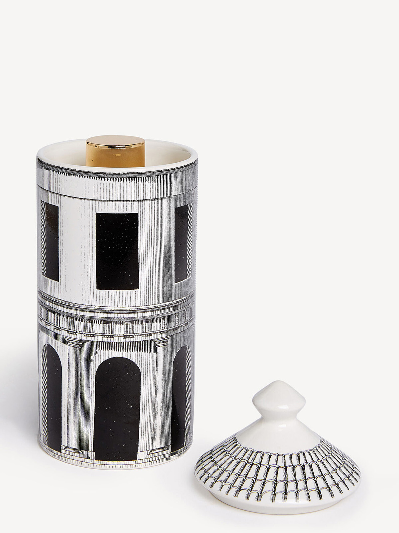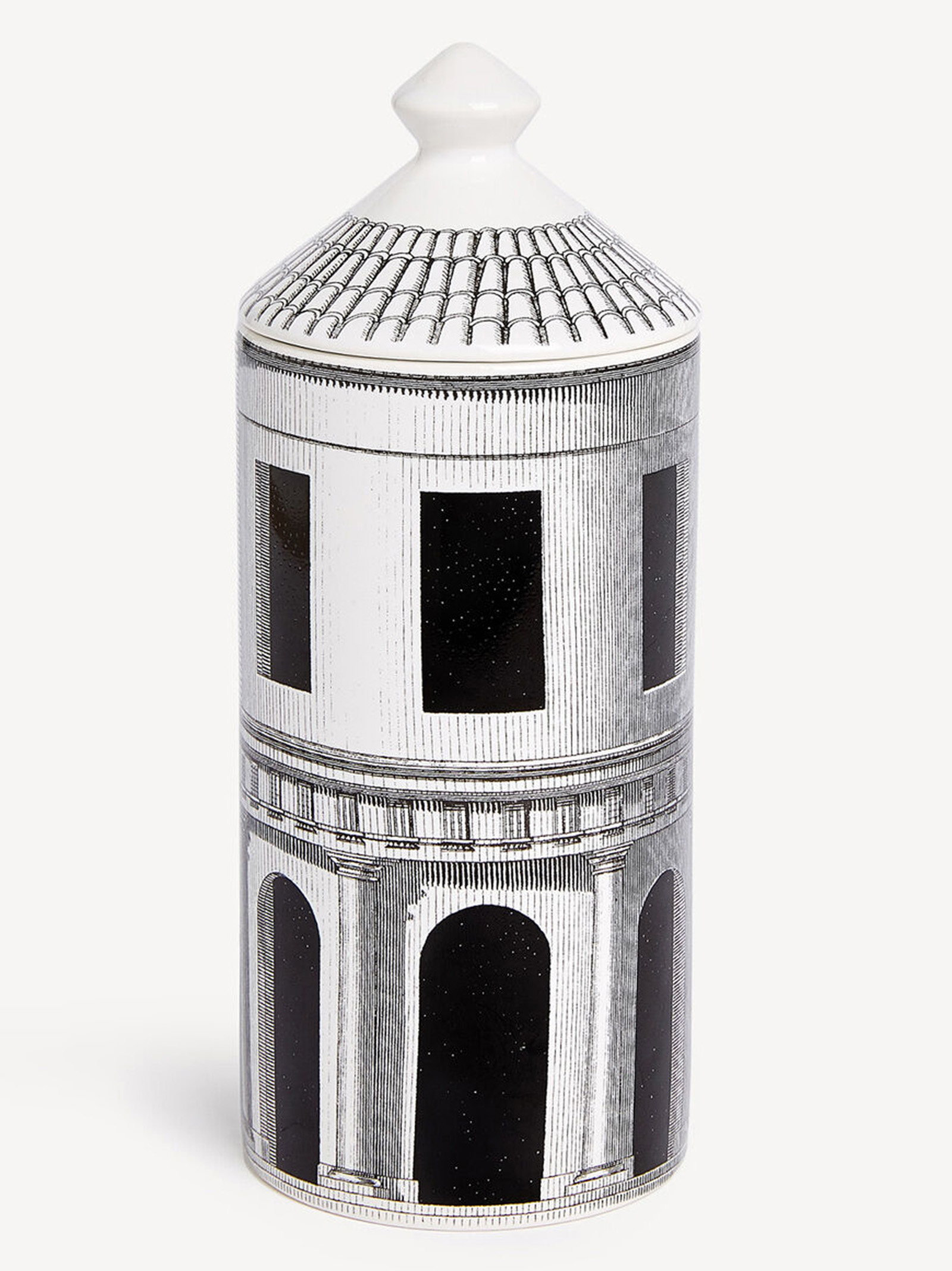 The Architettura decoration by Fornasetti is an imaginary urban landscape suspended in time and history.