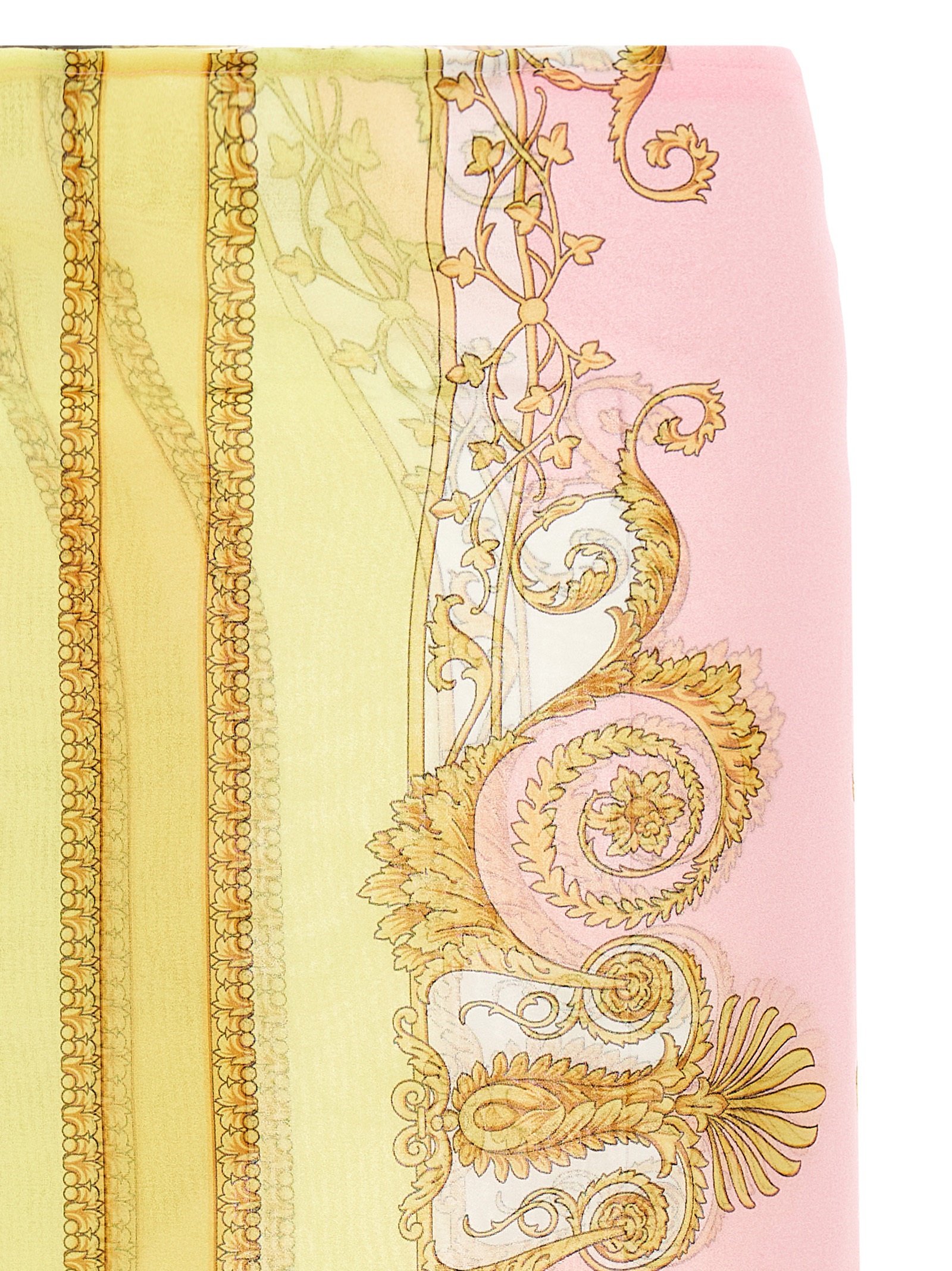 Semi-transparent georgette skirt with ‘Spring Barocco’ print, cover-up style, side self-tie closure.