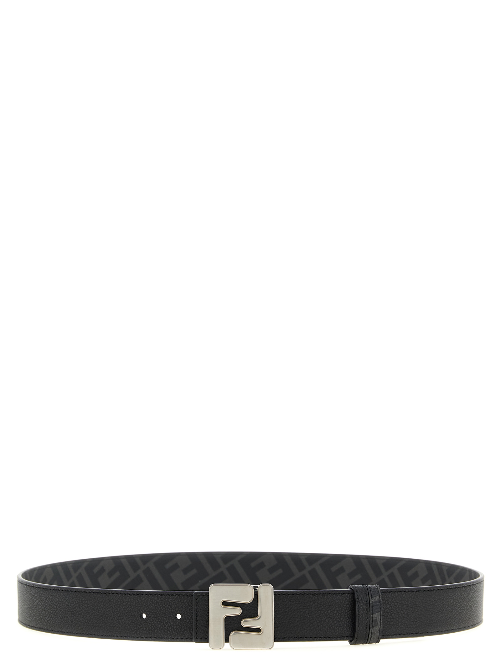 Reversible belt in hammered leather and FF canvas, iconic metal ‘Squared FF’ cufflink closure.