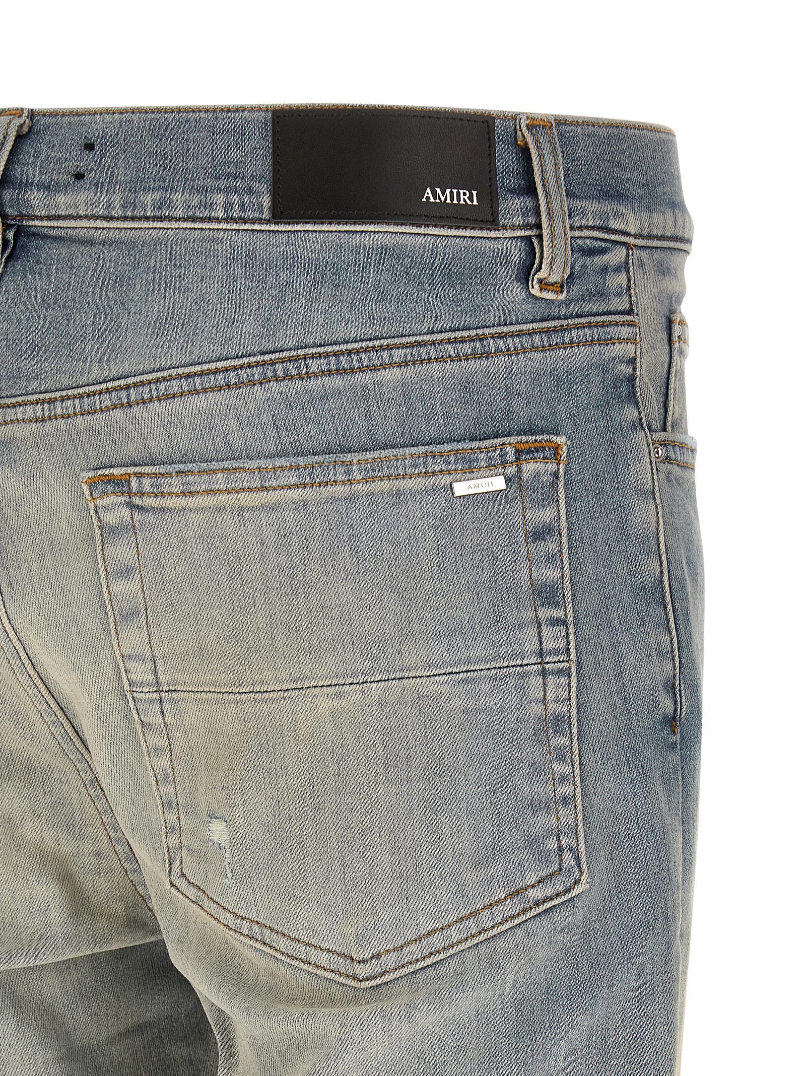 ‘Stack’ used-effect stone washed stretch Italian cotton denim jeans, contrast stitching, front button closure, five pockets, back leather logo tag.