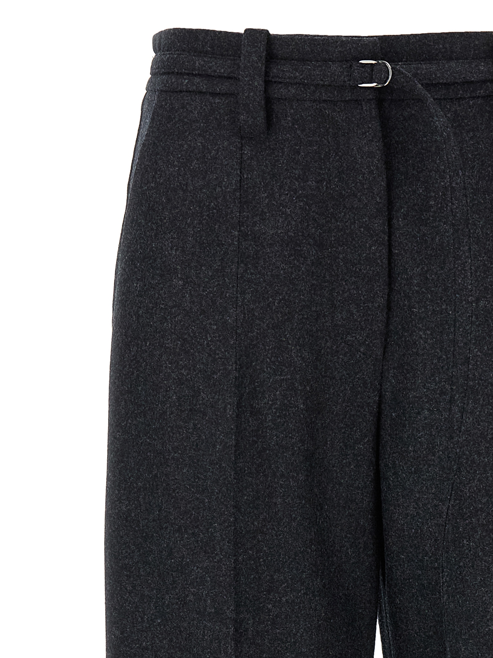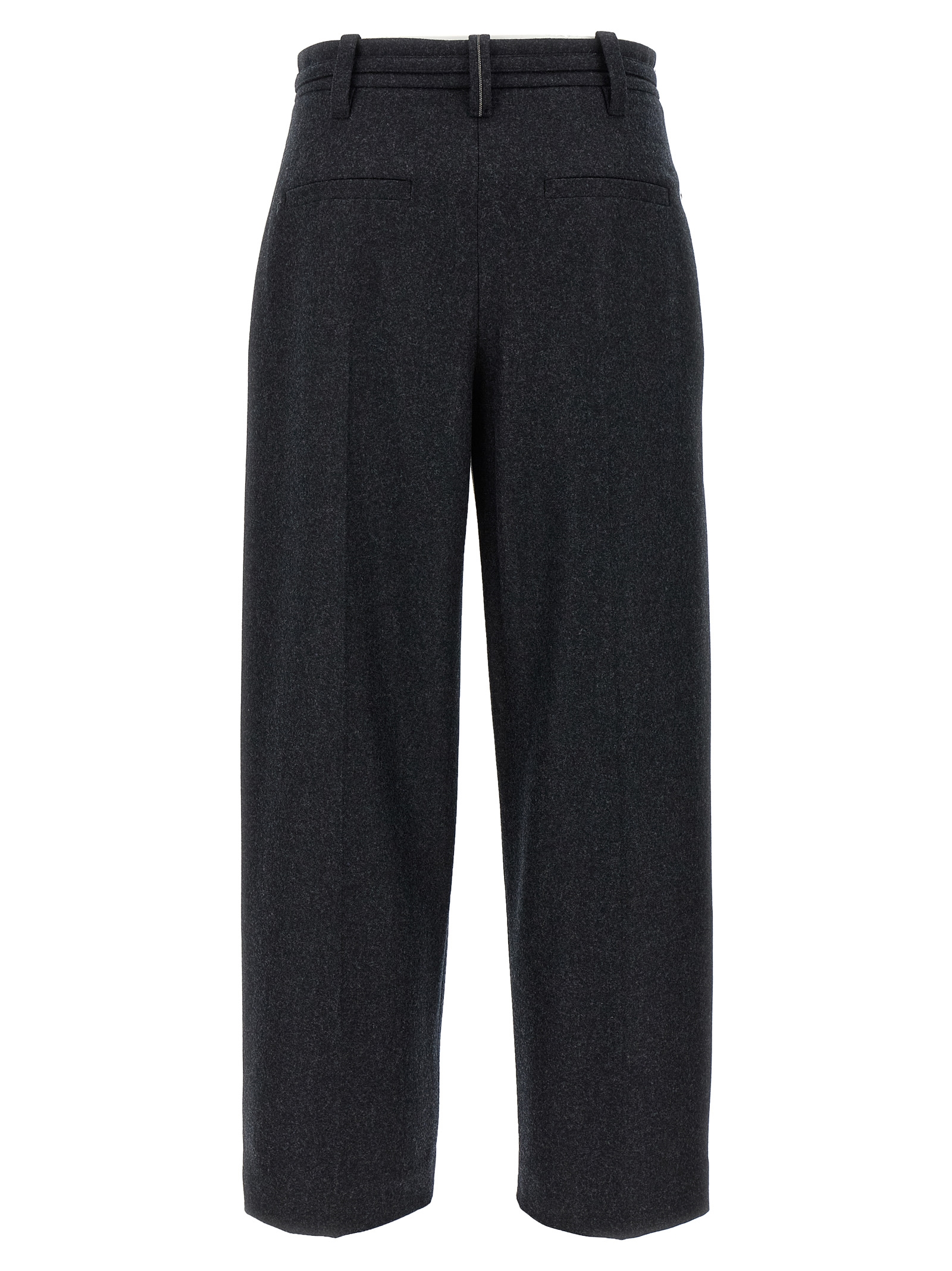 ‘Straight Crop’ virgin wool flannel pants, pleats with stretched pleat, hook and button zip closure, pockets, wide and straight leg, crop model, back Monile detail, removable belt.