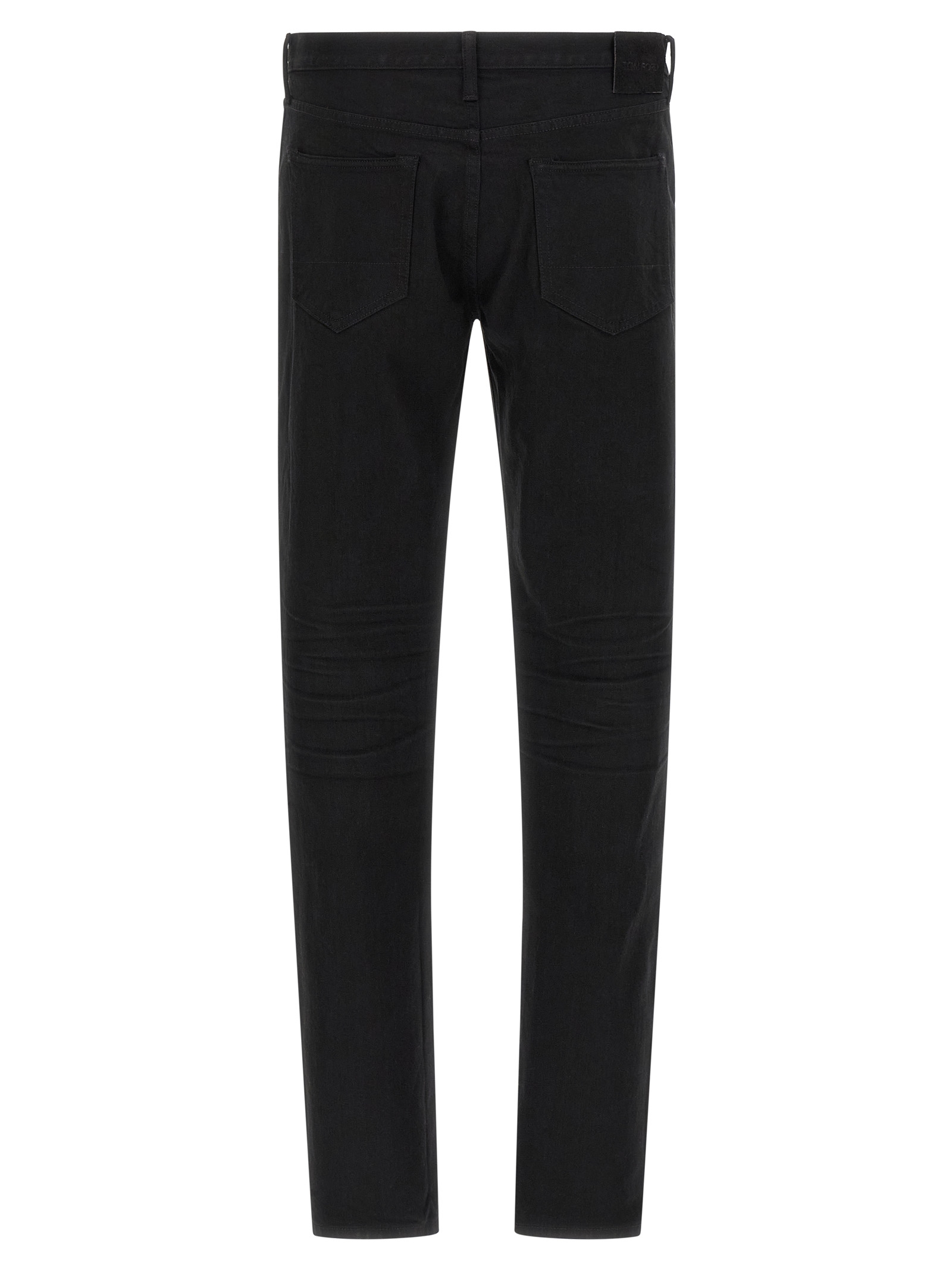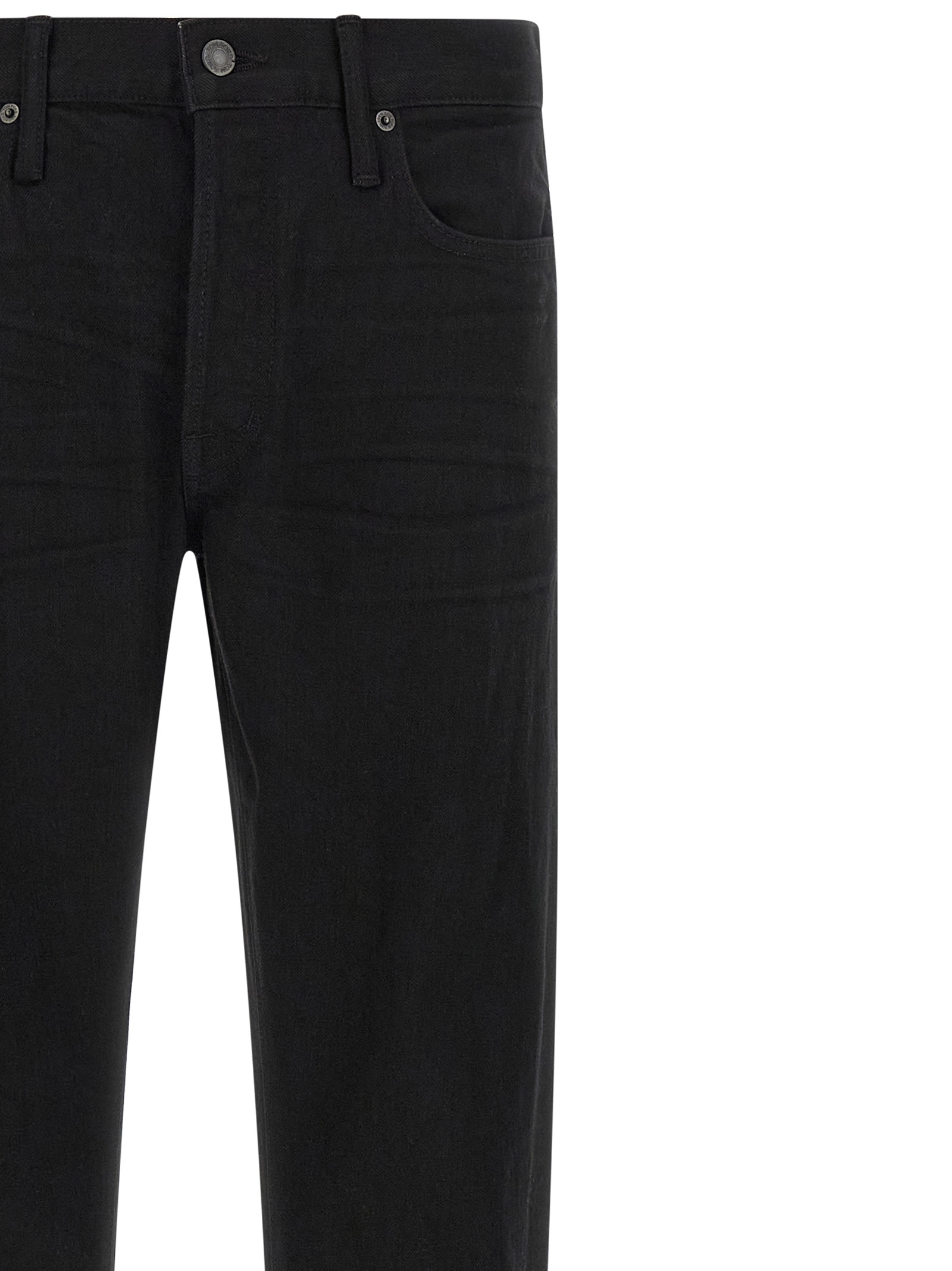 Garment-dyed selvedge stretch denim jeans with straight leg, front button closure, five pockets, tone-on-tone suede logo tag at the back.