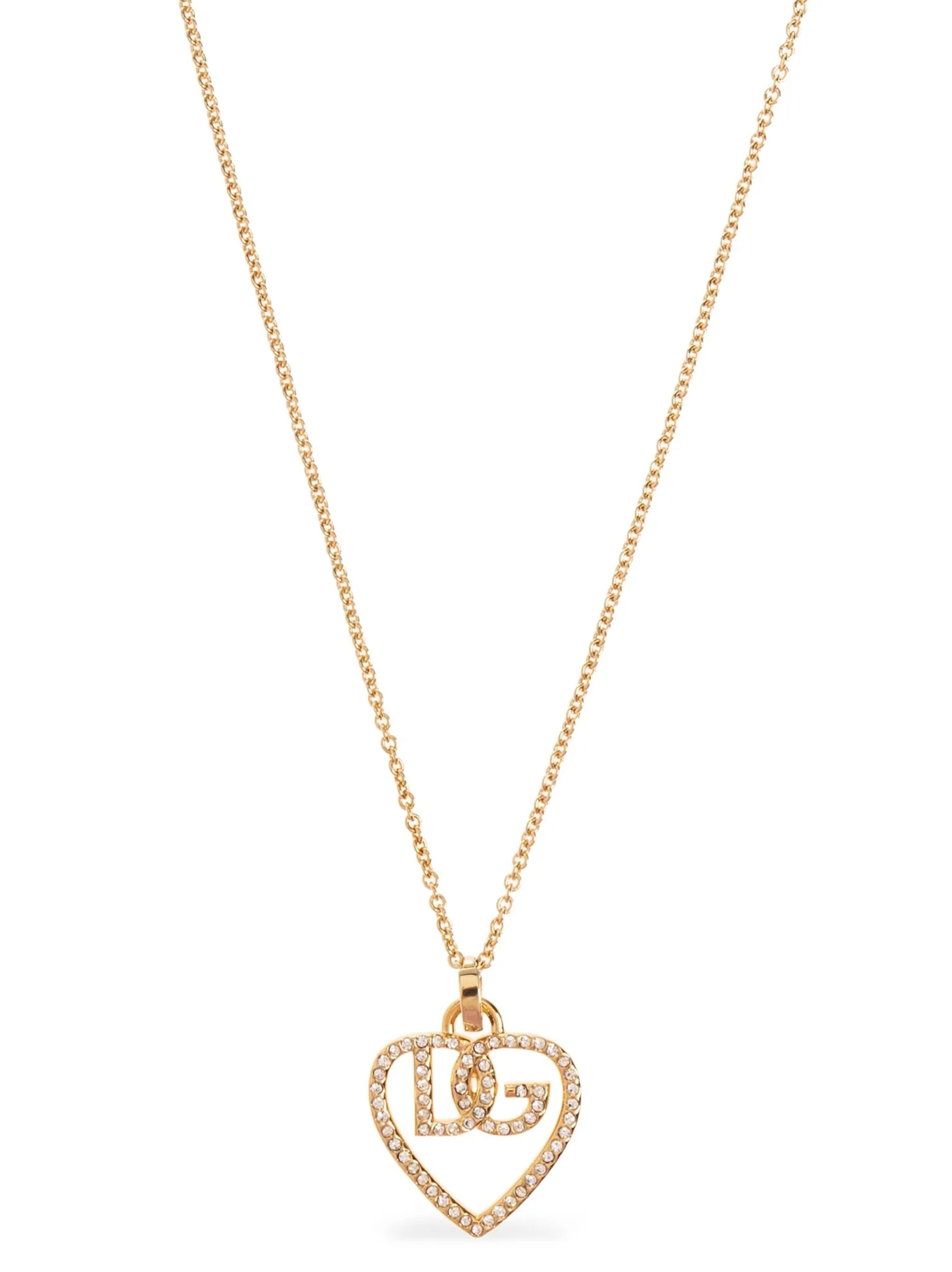 Metal necklace with rhinestone logo pendant, adjustable, clasp closure.