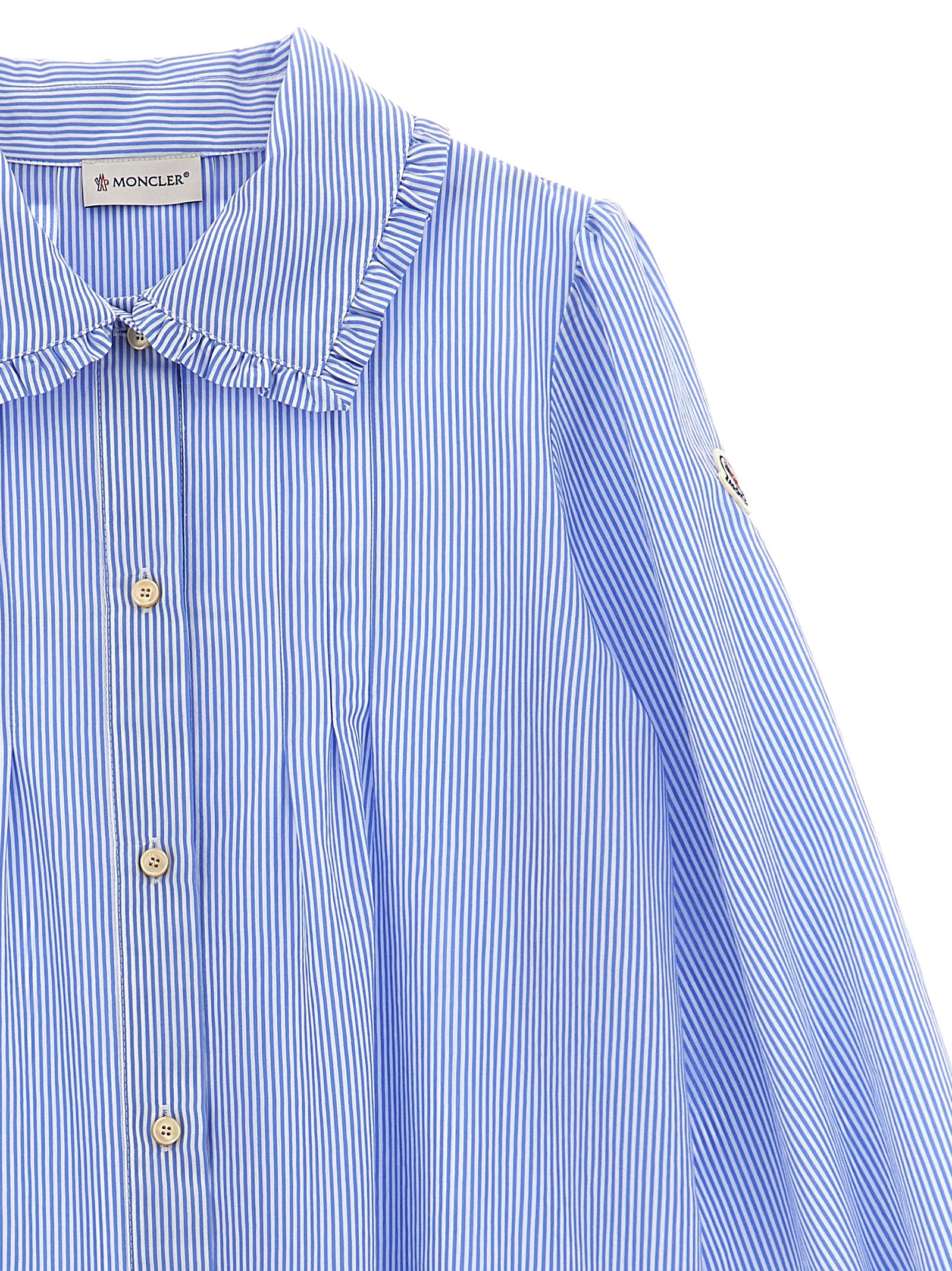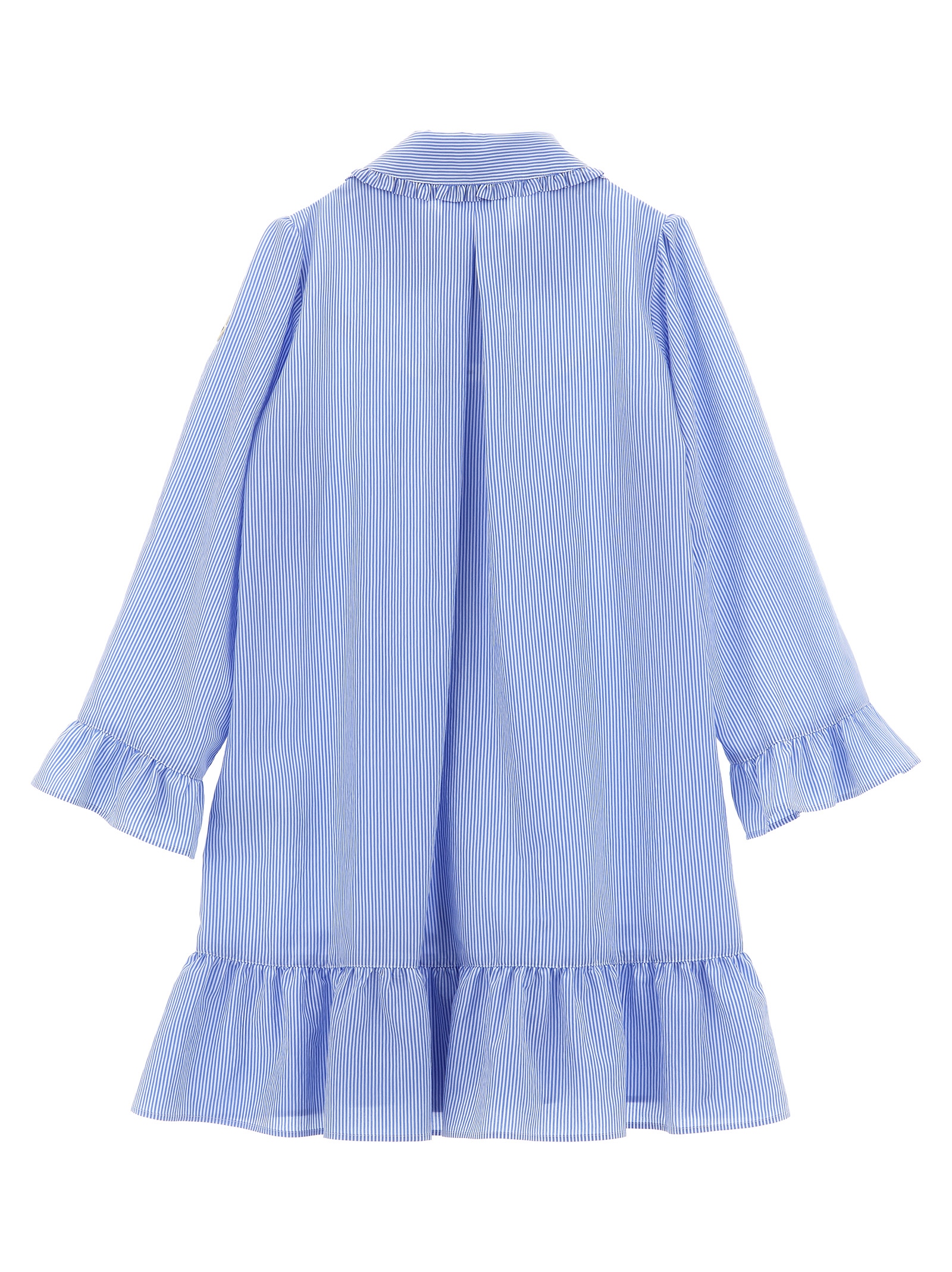 Striped viscose blend dress, chemisier style, ruffle collar, mother-of-pearl button closure on the front, ruffle on the cuffs and garment, long sleeves with felt logo patch appliqué.