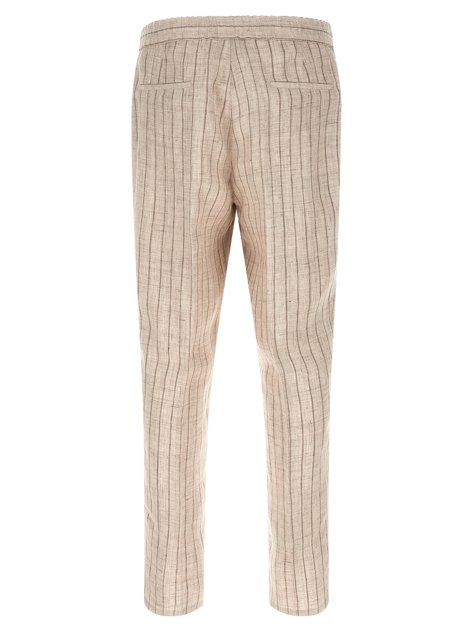 Striped linen gabardine trousers, straight leg model with front pleat, front zip closure, hook and counterbutton, back elastic waistband and adjustable drawstring, side and back welt pockets, simple hem.