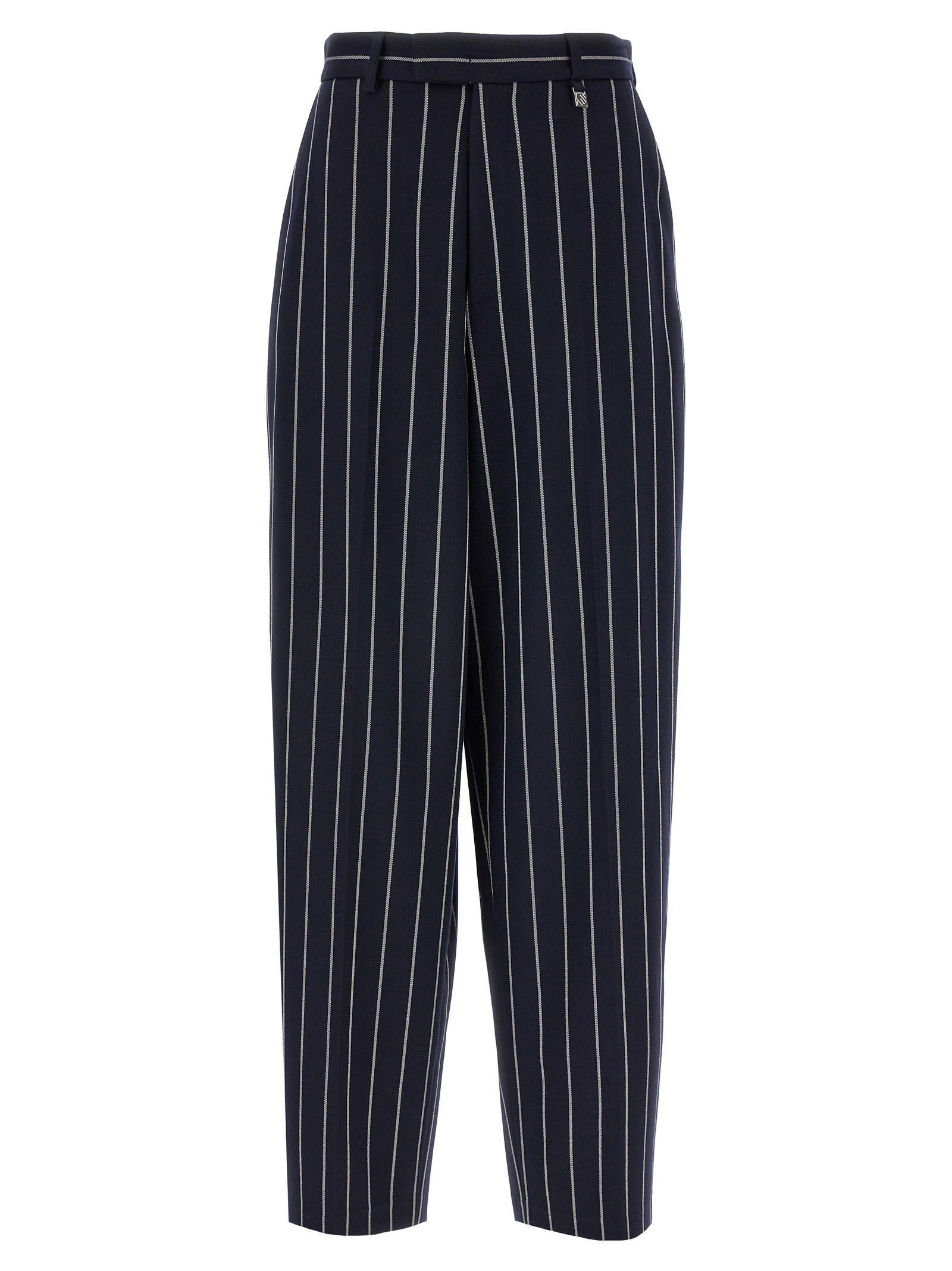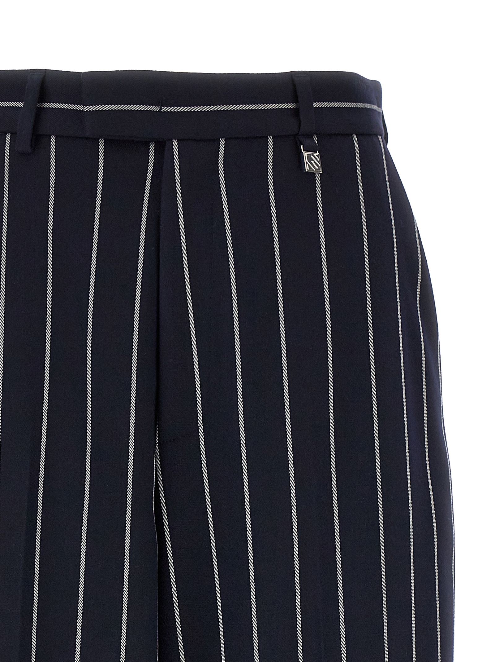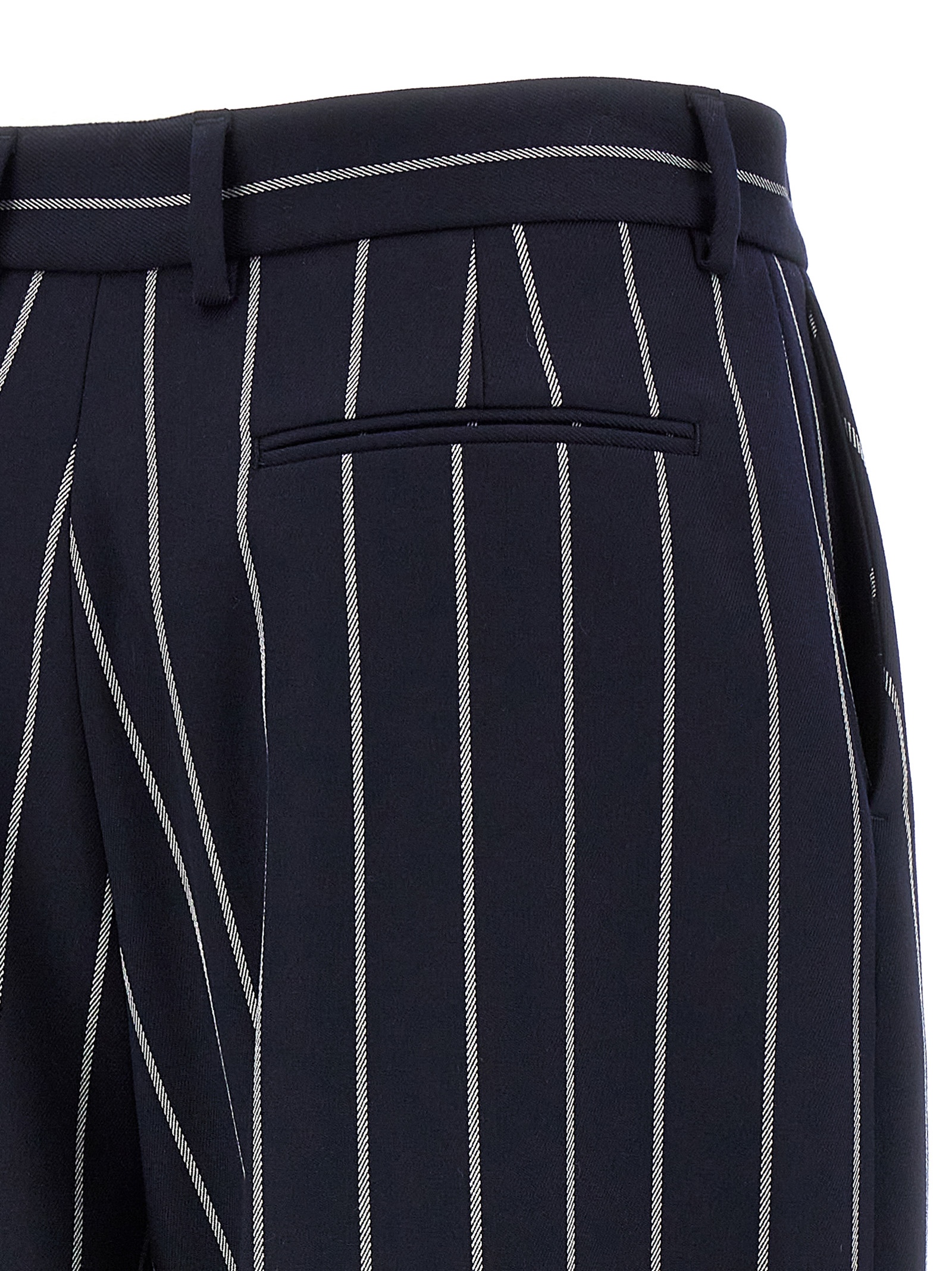 Striped viscose blend trousers, hook and button zip closure, pockets, straight leg with stretched crease.
