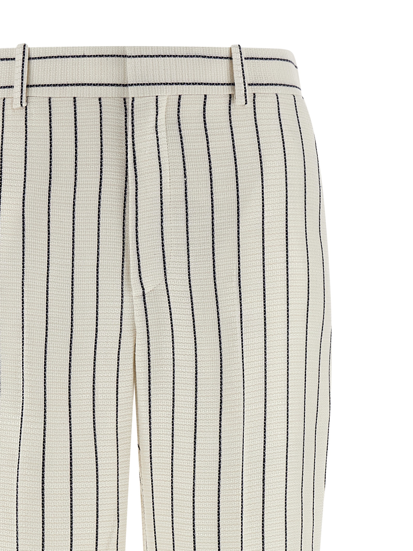 Striped viscose and linen blend trousers, straight leg, stretched pleat, hook and front button zip closure, pockets.