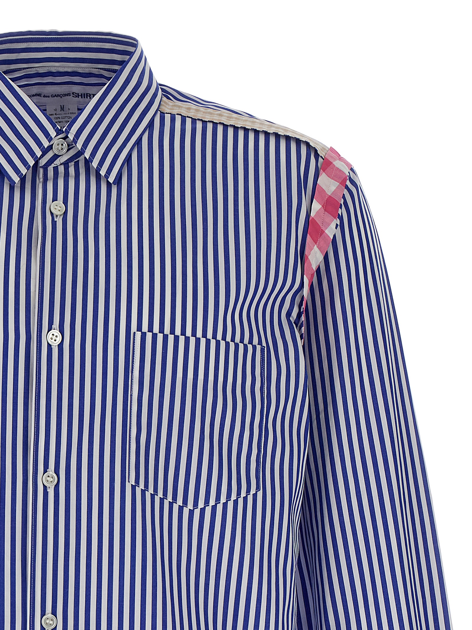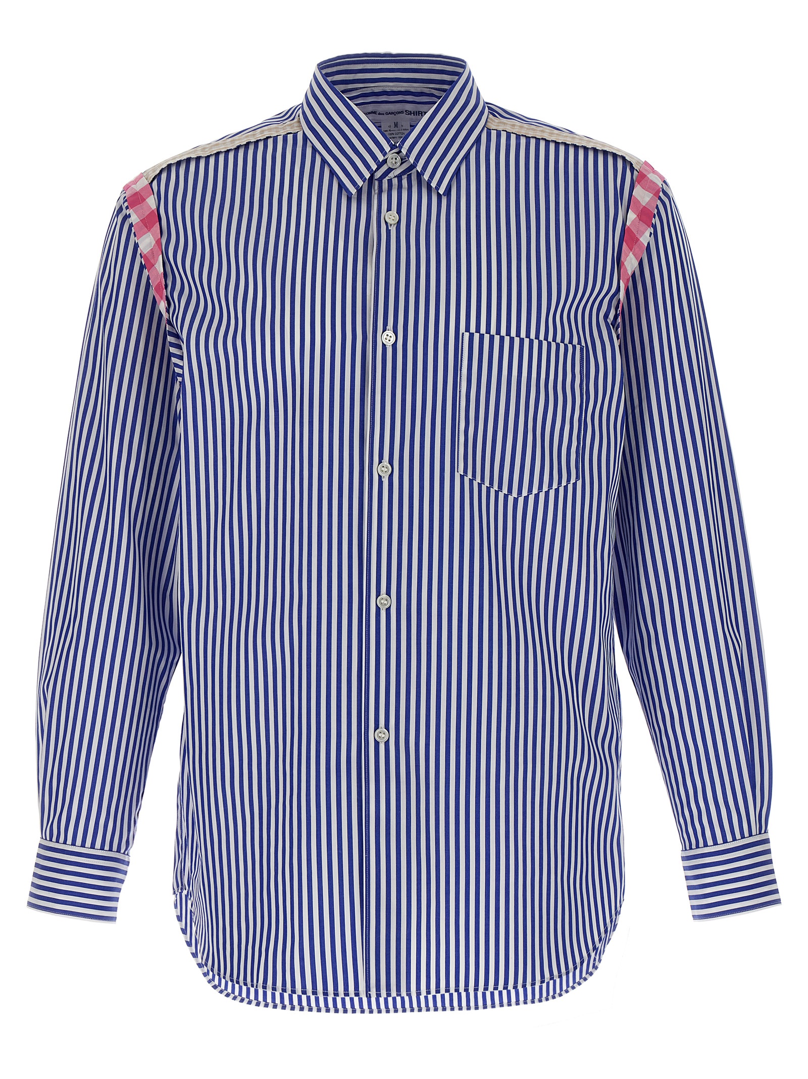 Striped cotton poplin shirt with check inserts, chest pocket, front button closure, long cuffed sleeves.