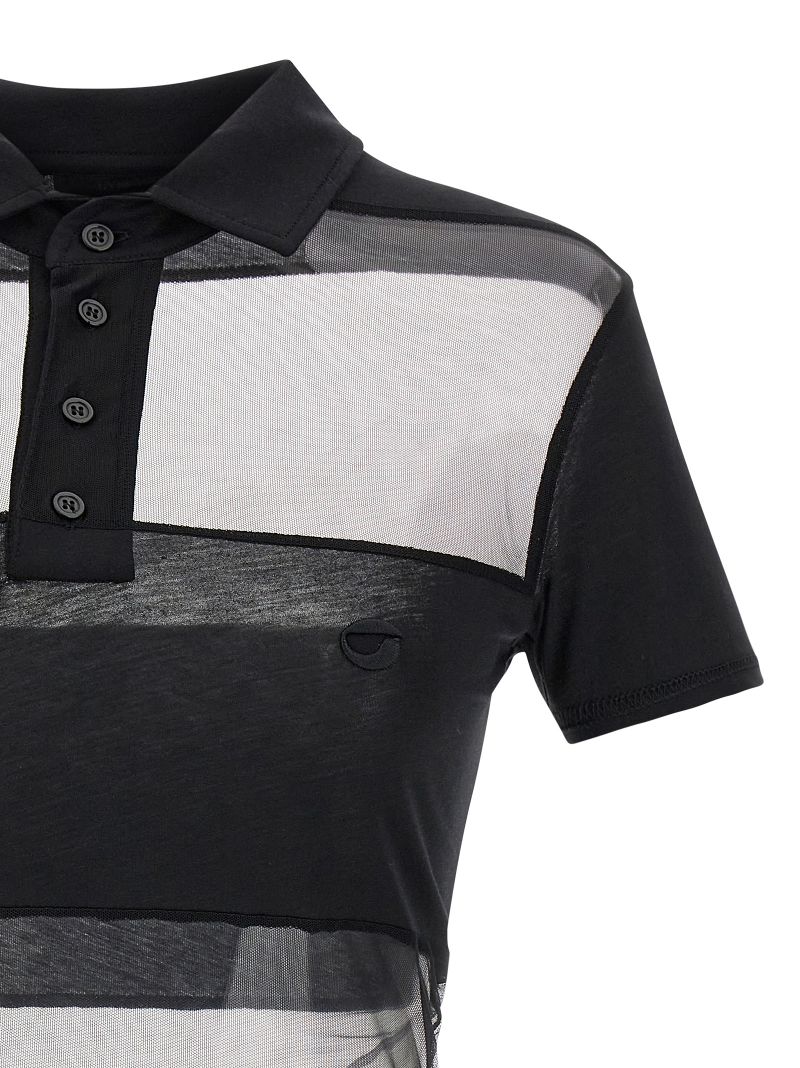 ‘Sheer Striped’ polo shirt in stretch technical fabric with alternating opaque and transparent stripes, tone-on-tone logo embroidery on the front, collar, and buttons, short sleeves.