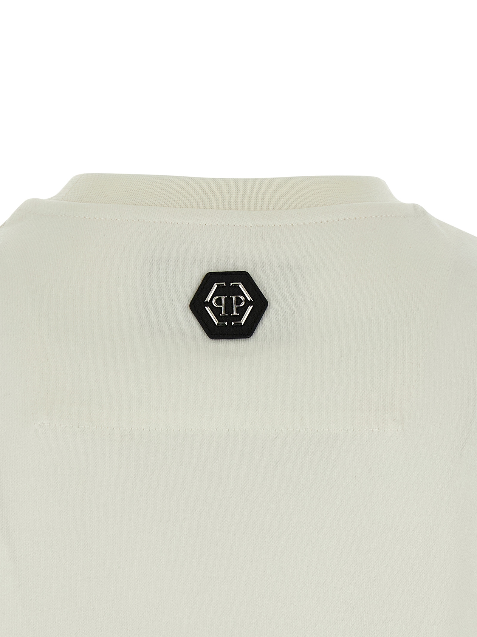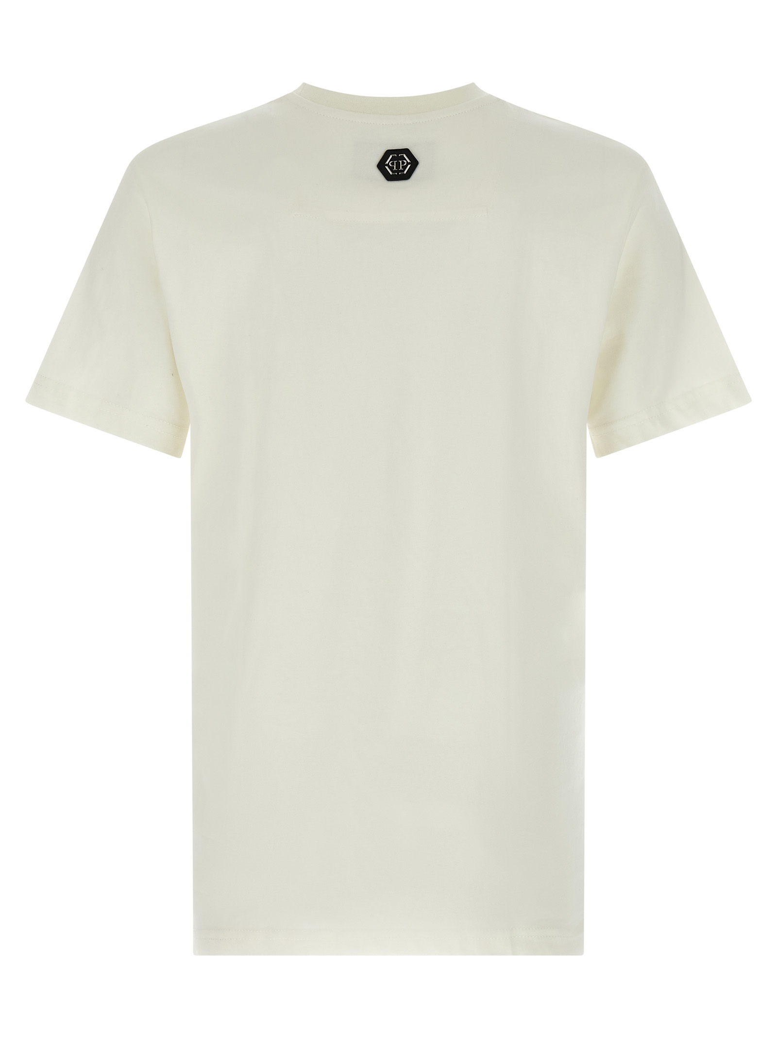 ‘Stripes’ cotton jersey T-shirt with front print, leather patch with back metal logo, crew neck, short sleeves.