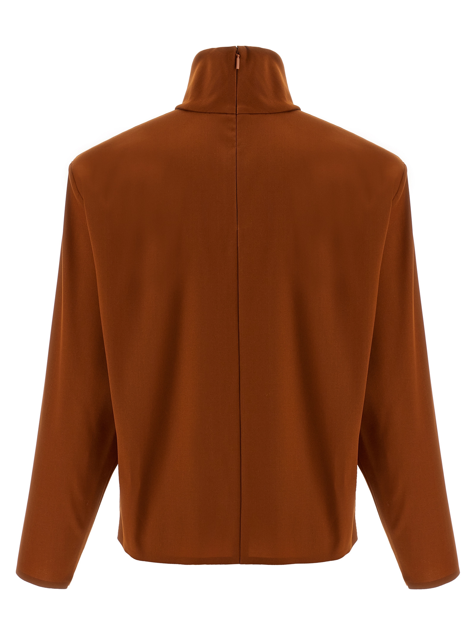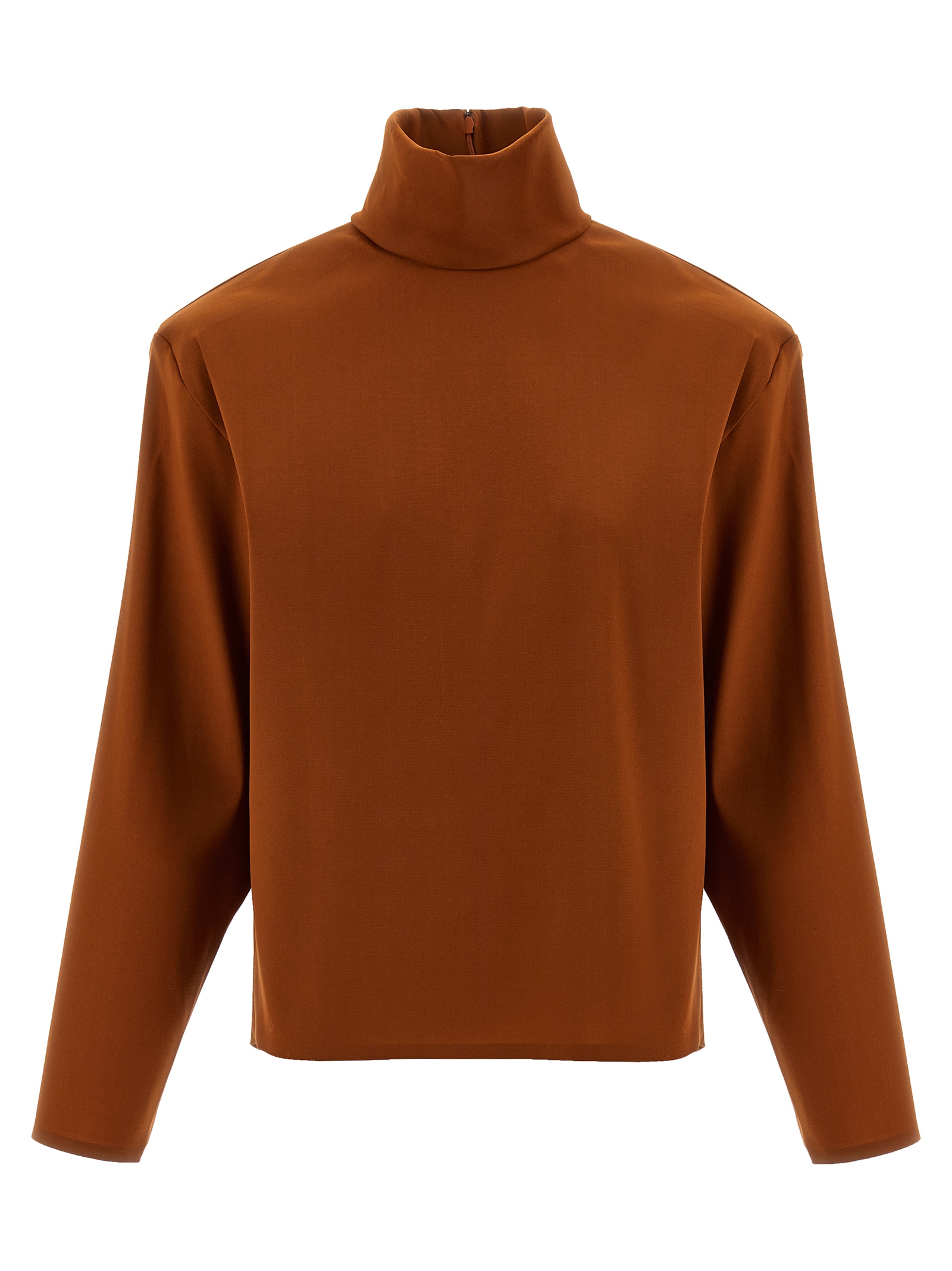 Stretch super organza sweater, high neck, structured shoulders with iron support, long sleeves, back zip closure.