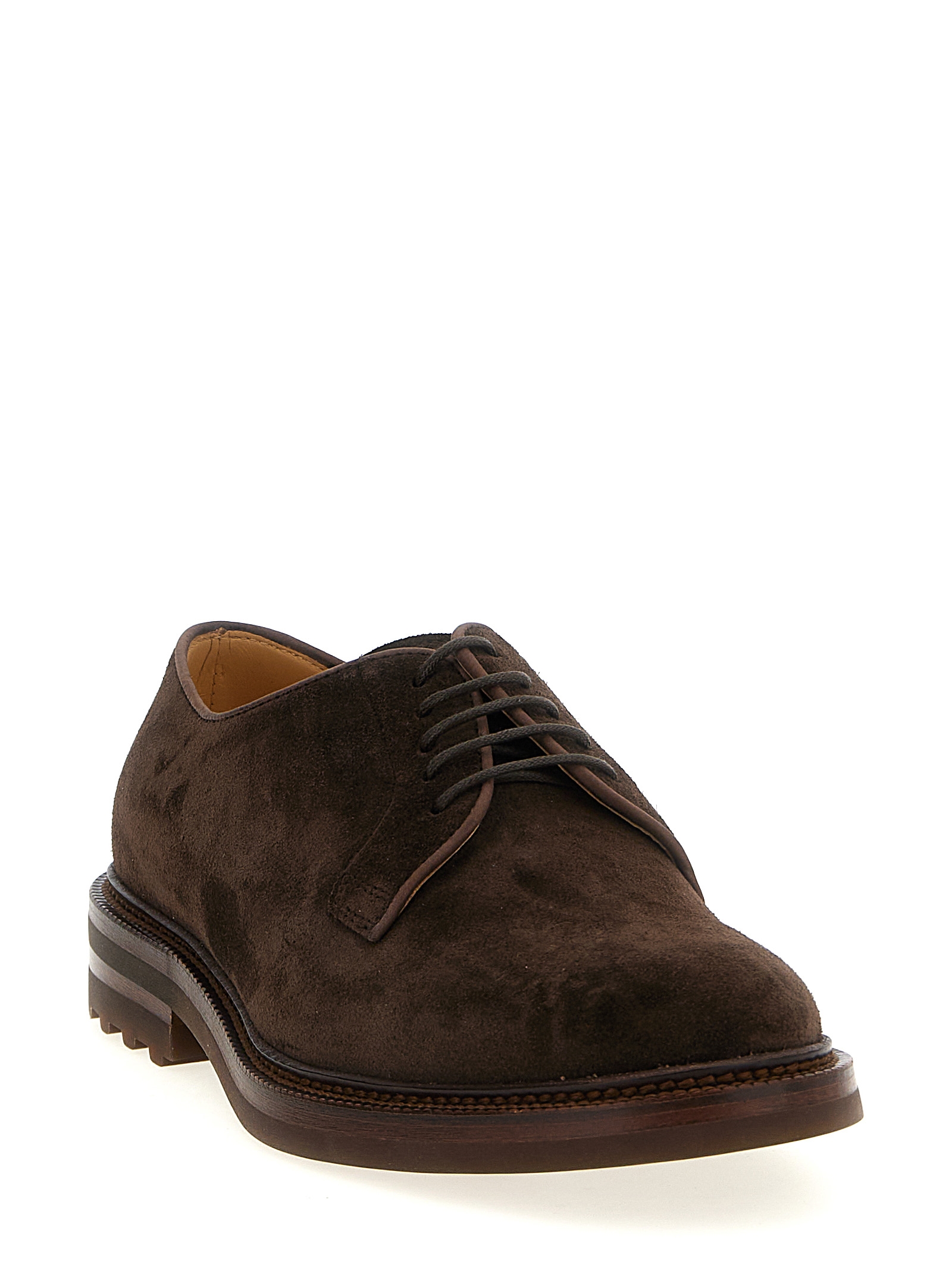 Suede derby shoes with laces closure, leather welt with contrast stitching, lightweight rubber sole.