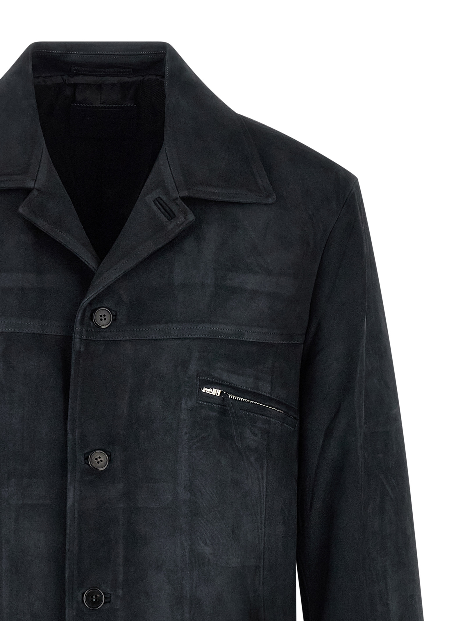 Suede jacket with shirt collar, front button closure, pockets, long sleeves, back vents, viscose lining.