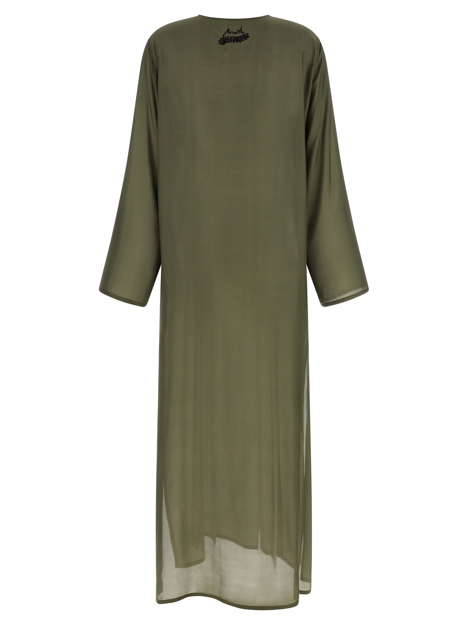 Long ‘Sunset’ dress in light silk with floral embroidery of sequins and beads front and back, tunic model, crew neck, front button closure, long wide sleeves, pockets, side slits.