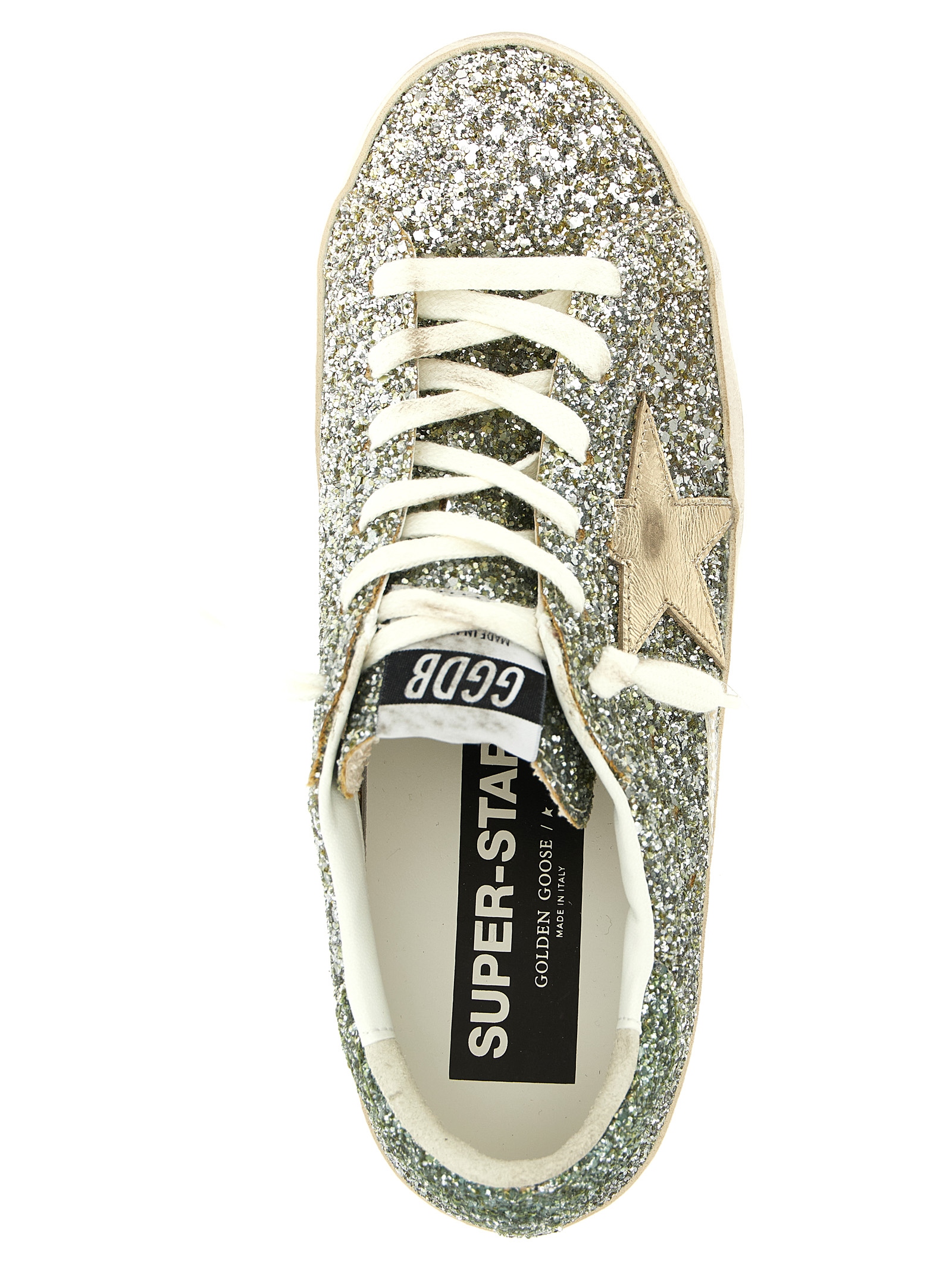 ‘Super Star’ sneakers in all-over glitter fabric with gradient effect, metallic leather star, lace-up closure, rubber sole.