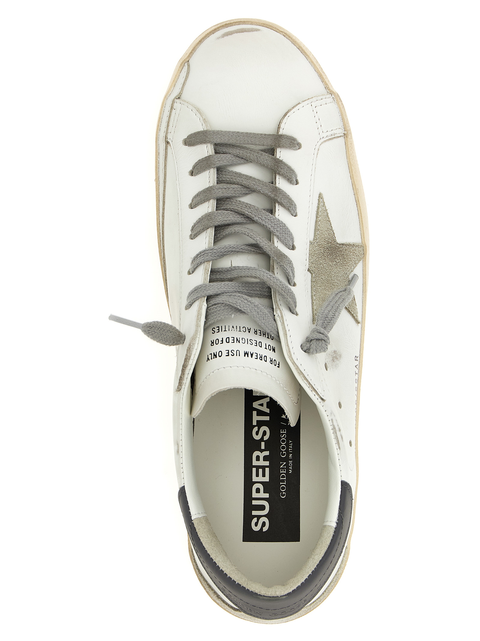 ‘Superstar’ leather sneakers with distressed details, lace-up closure, rubber sole.