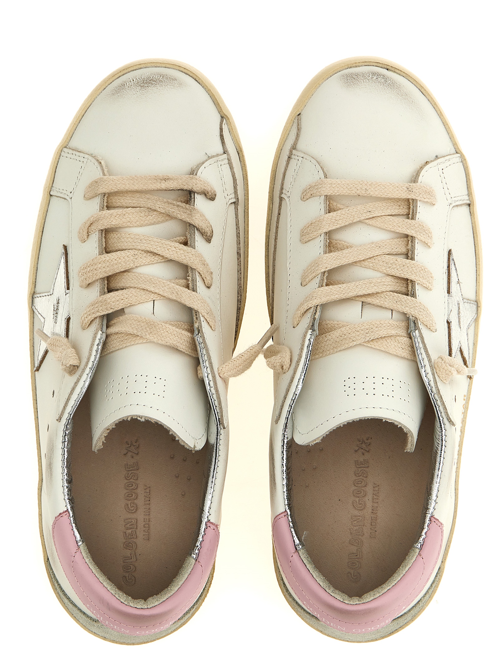 ‘Superstar’ leather sneakers with side star and contrast heel, lace-up closure, rubber sole, used-effect details.