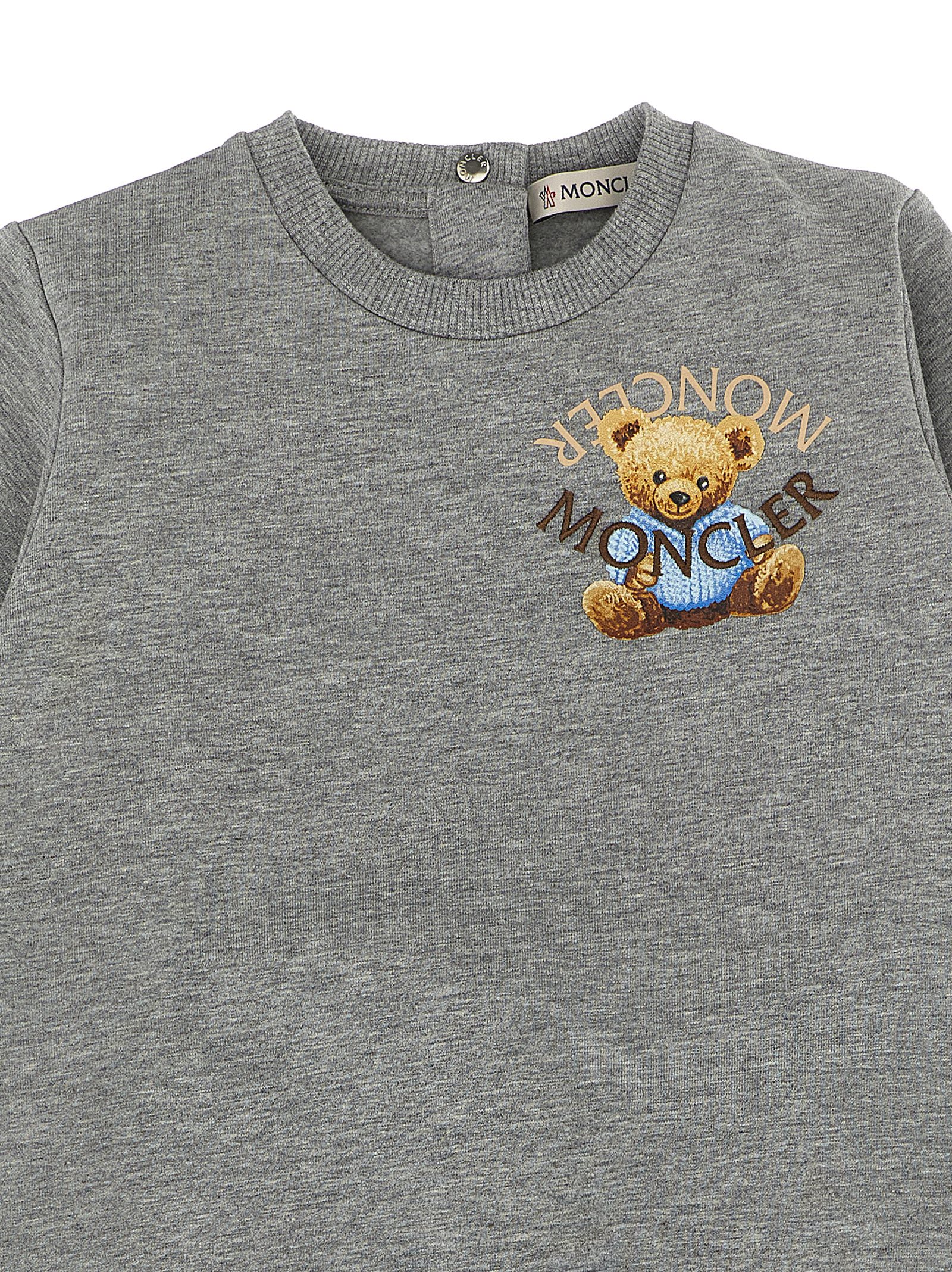 Slightly fleece mélange cotton suit consisting of a sweatshirt with print and front logo embroidery, crew neck with snap button closure on the back, long sleeves with cuffs and felt logo patch and joggers with elastic waistband, trompe l’oeil flap, pockets, ankle cuffs.