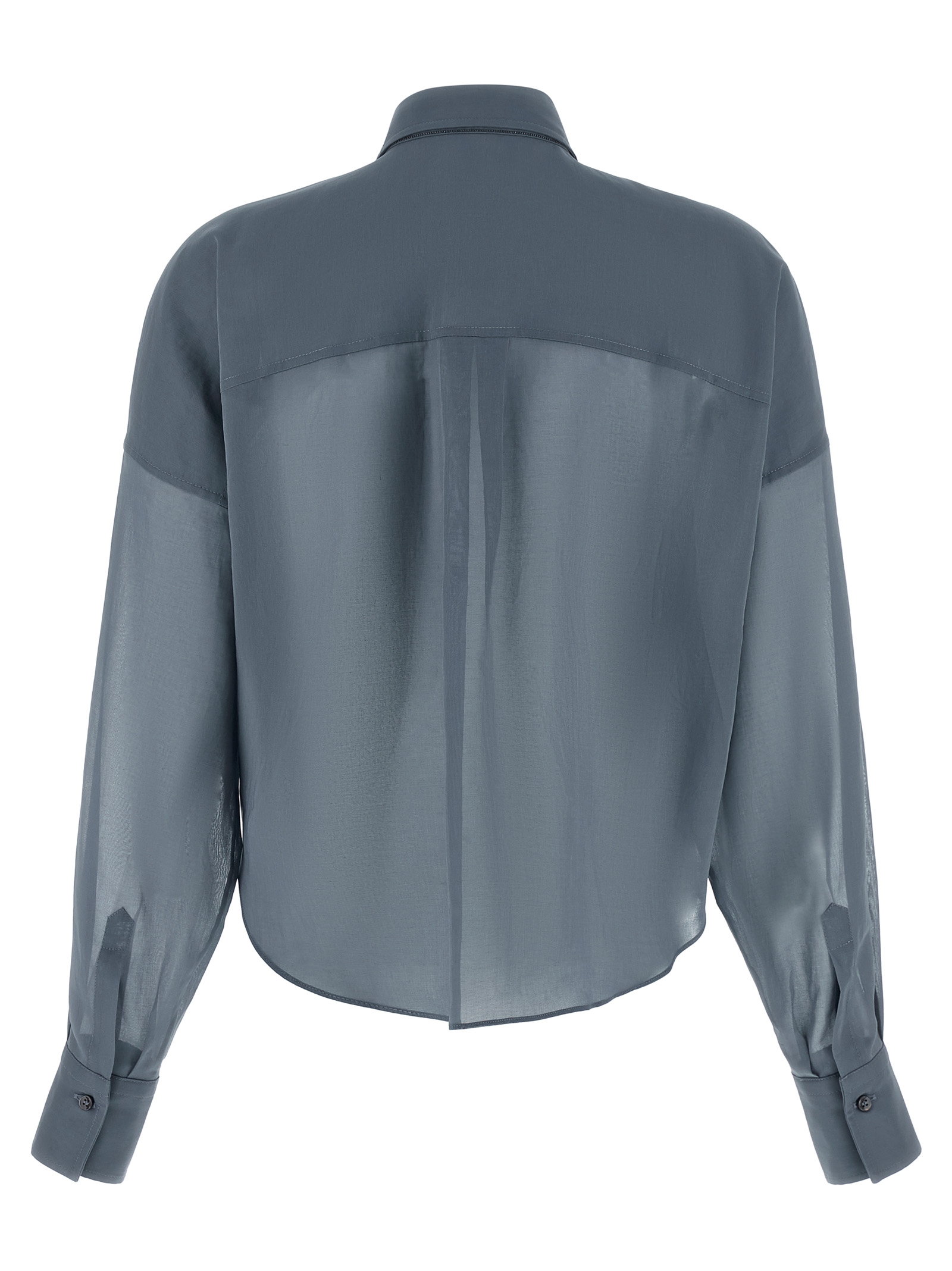 Semi-transparent cotton taffeta shirt, pointed collar with back Monile detail, front button closure, asymmetric hem with front rolled knot detail, long wide sleeves with cuffs and dropped shoulder.