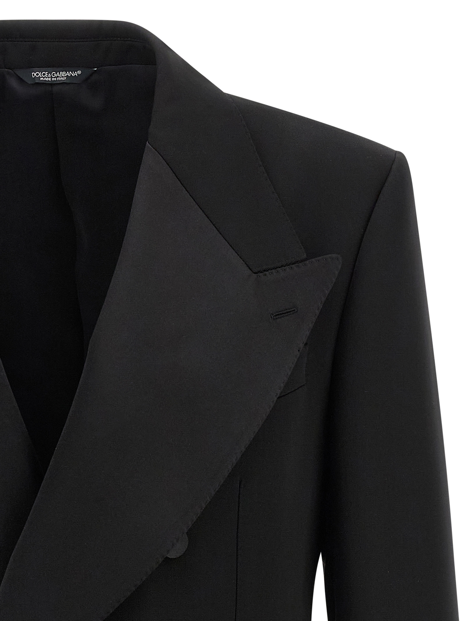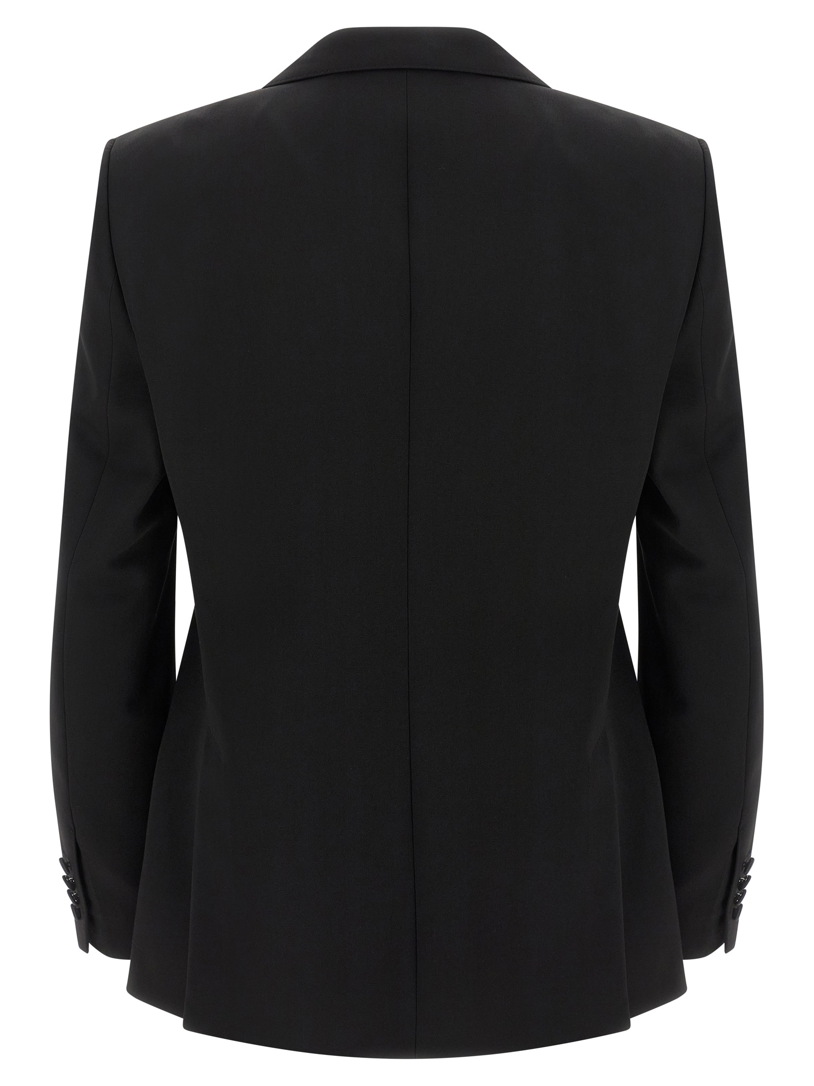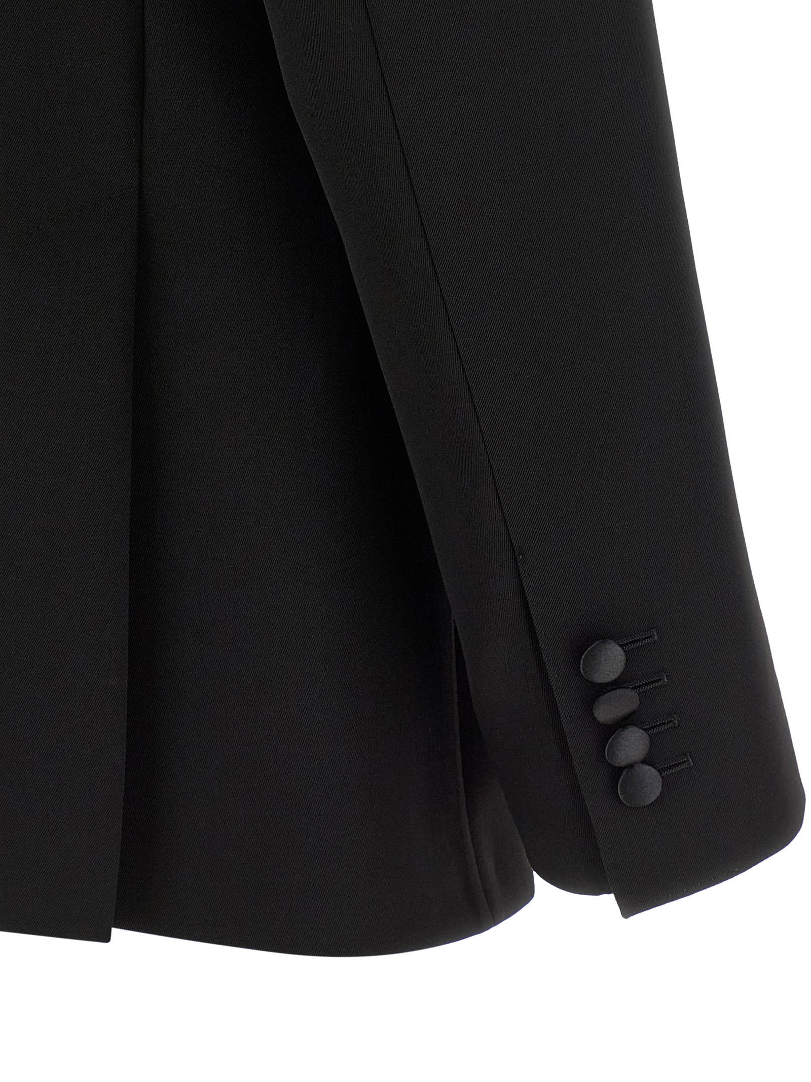 Double-breasted blazer in wool and silk blend with sartorial construction with satin details, front button closure, peak lapels, breast pocket, flap pockets, structured shoulder strap, buttonhole cuffs, back vents, silk lining.